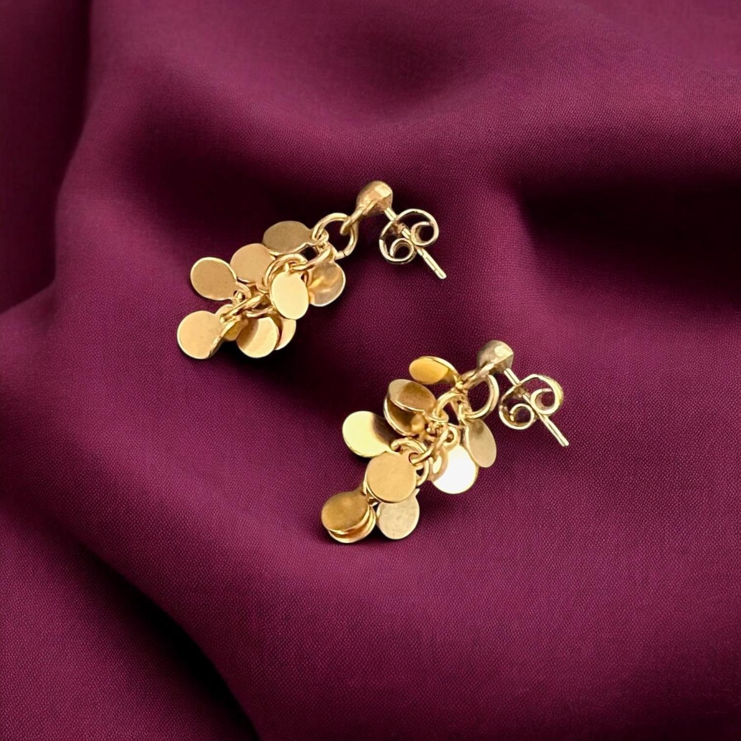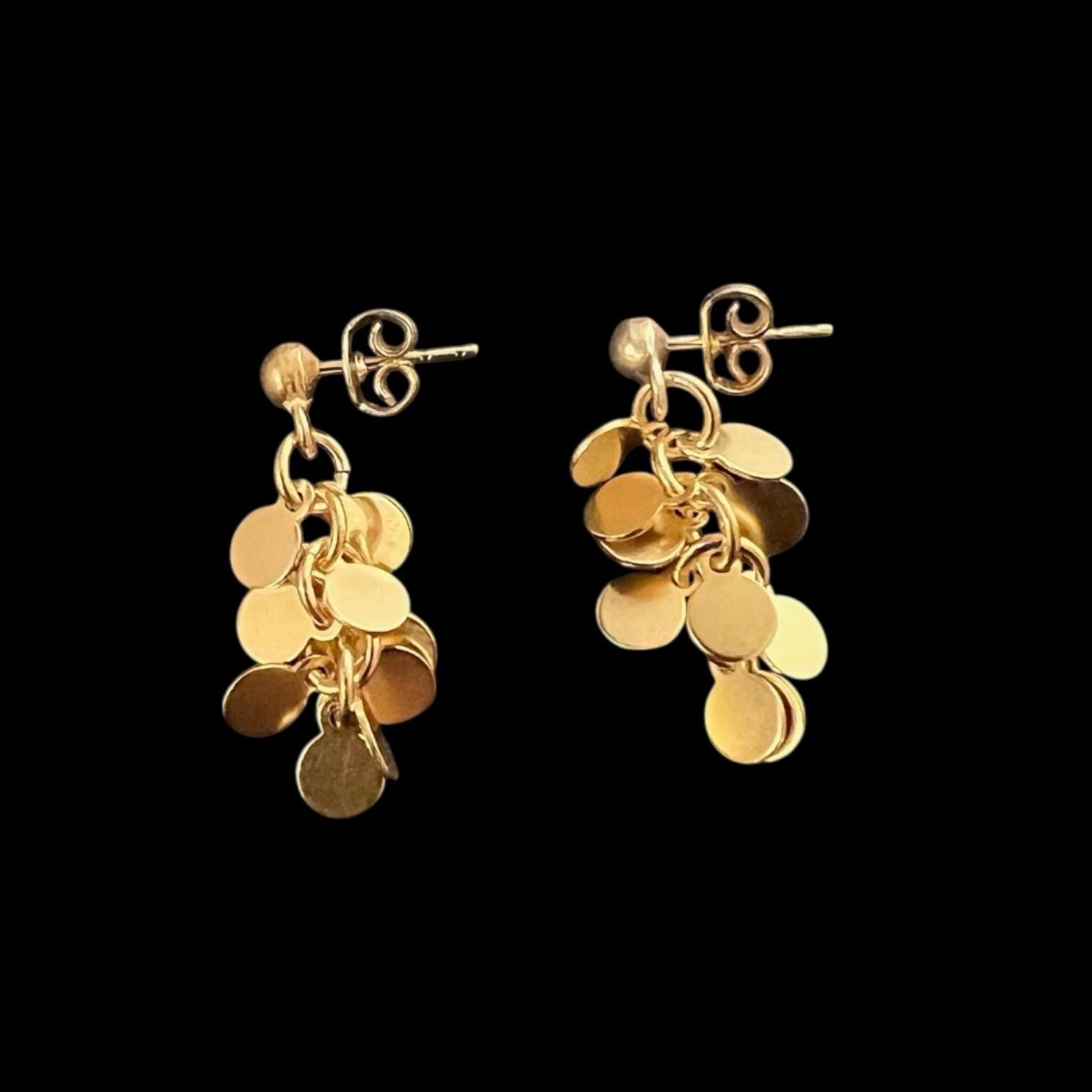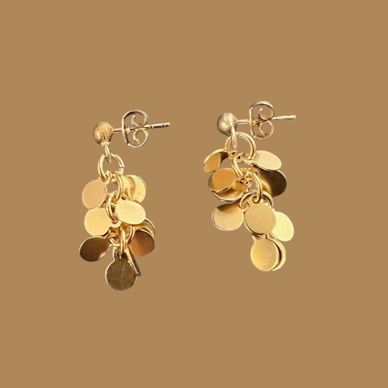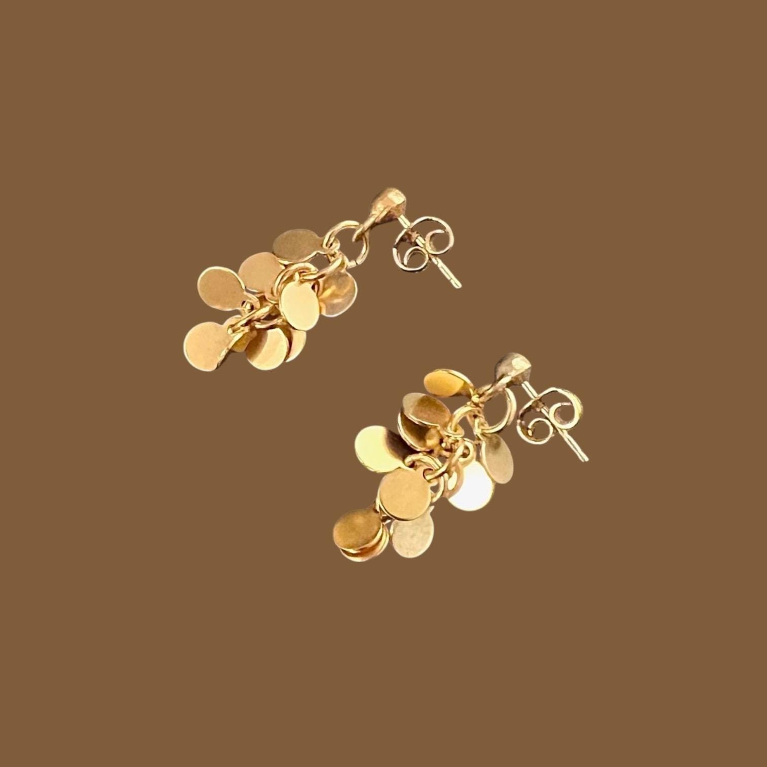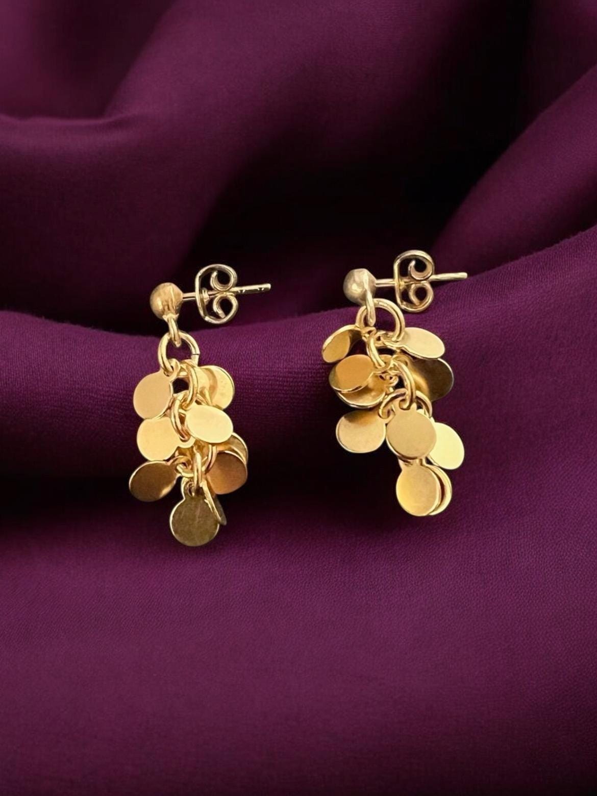 Unique, elegant stud earrings with small round metal discs, the diameter of the discs is approx. 5 mm, the total length of the earrings is approx. 33 mm, gold-plated, nickel-free surface, tarnish-resistant.