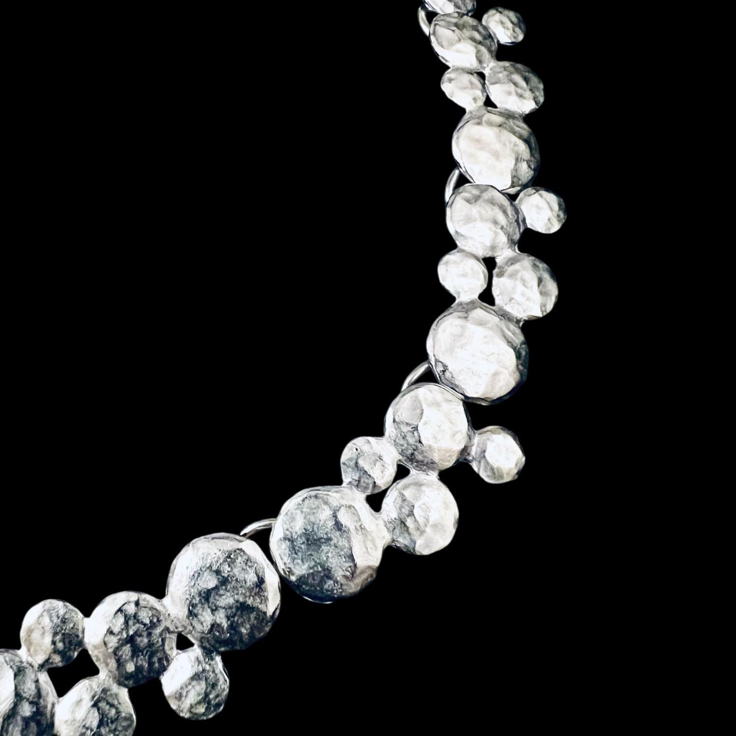 A wonderfully elegant necklace, matte silver-plated and tarnish-resistant, with a total length of 44 cm and an extension chain of approximately 6 cm. An exclusive necklace made of small, hammered elements.