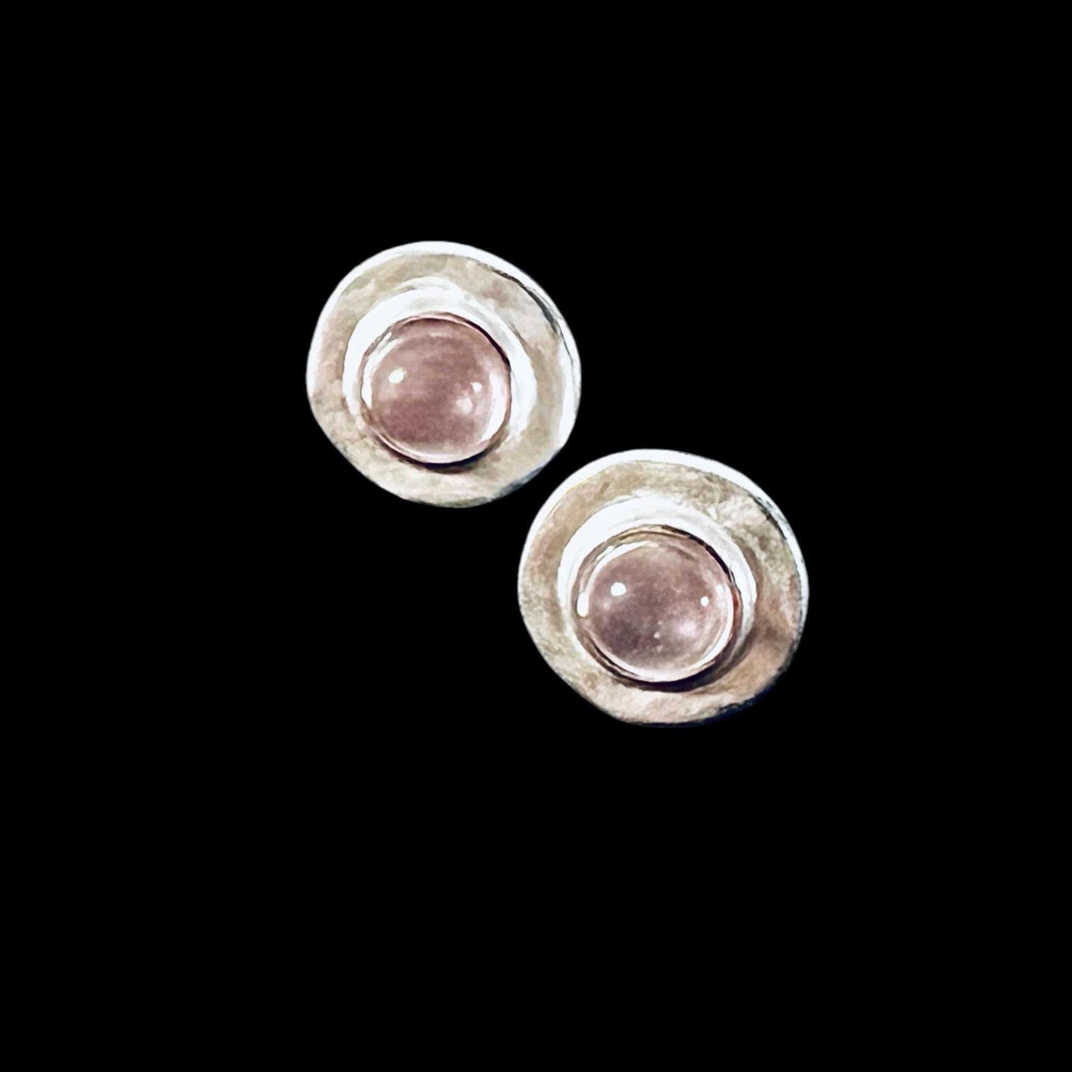 Beautiful pink North Sea silver stud earrings with a hammered finish. Round, hammered stud earrings, approximately 11 mm in diameter, with a luminous glass stone and silver leaf, approximately 5 mm in size.