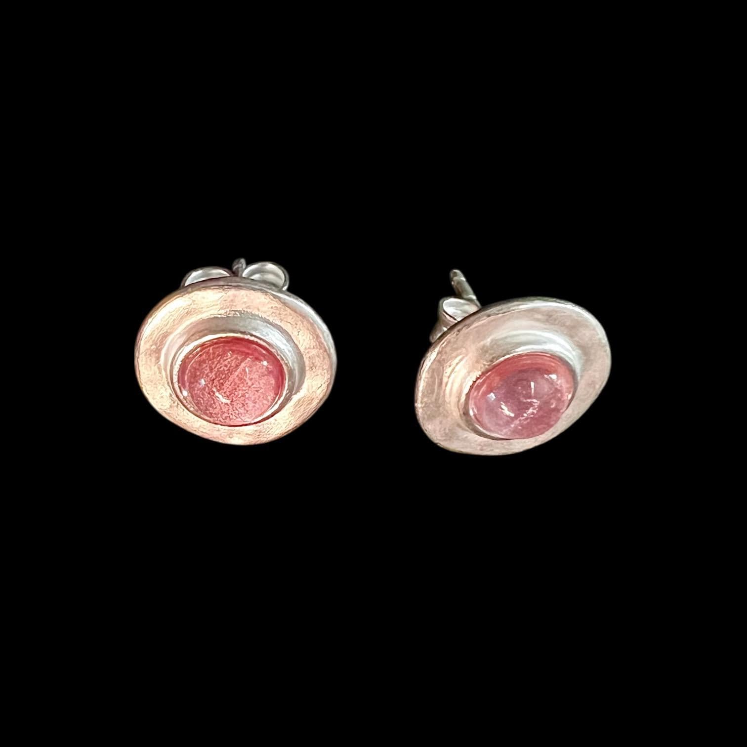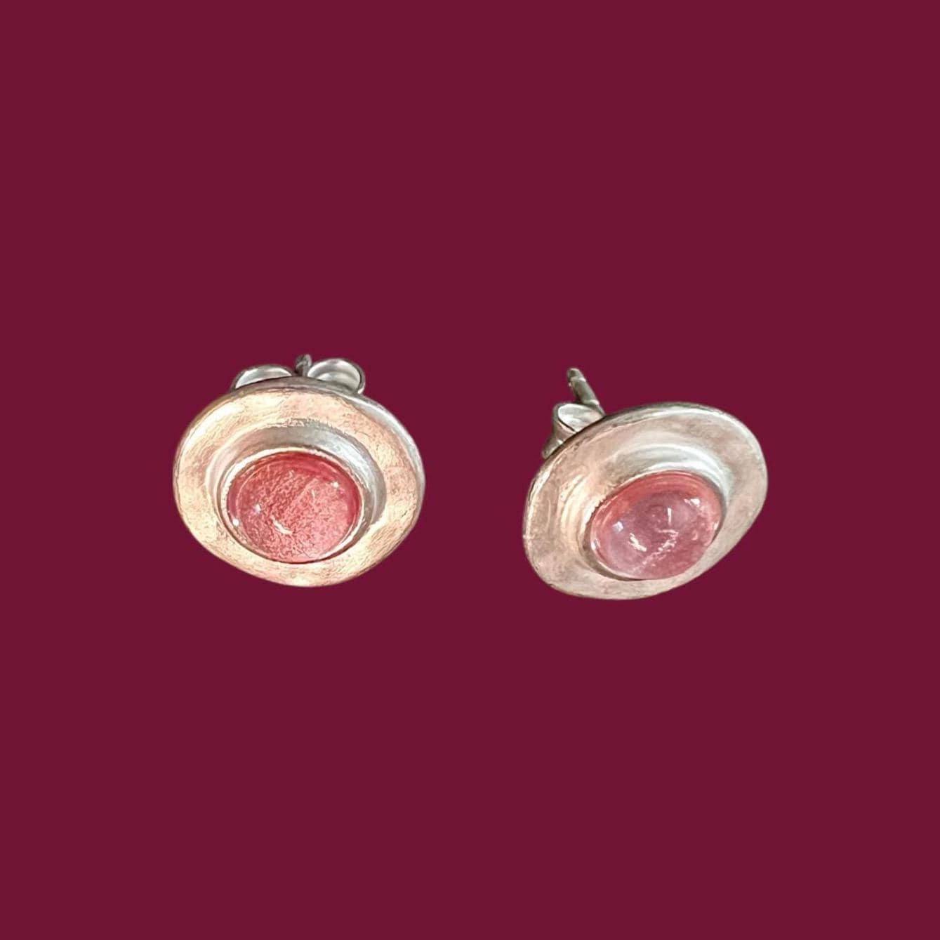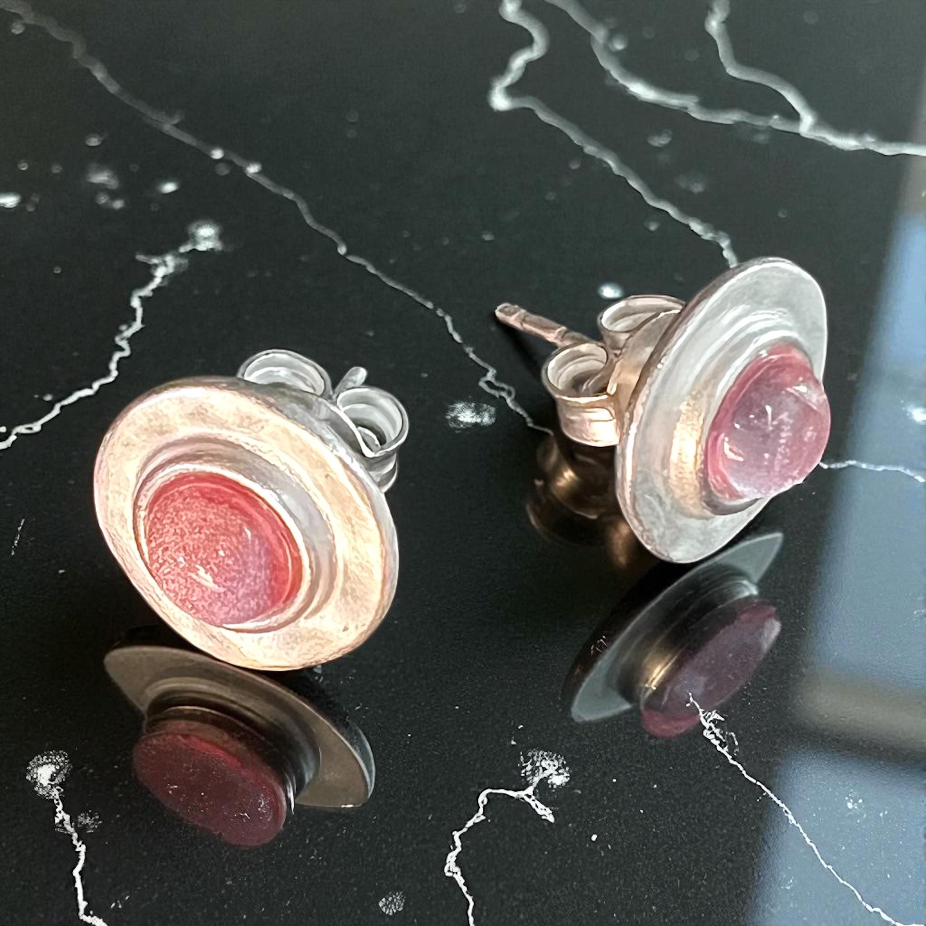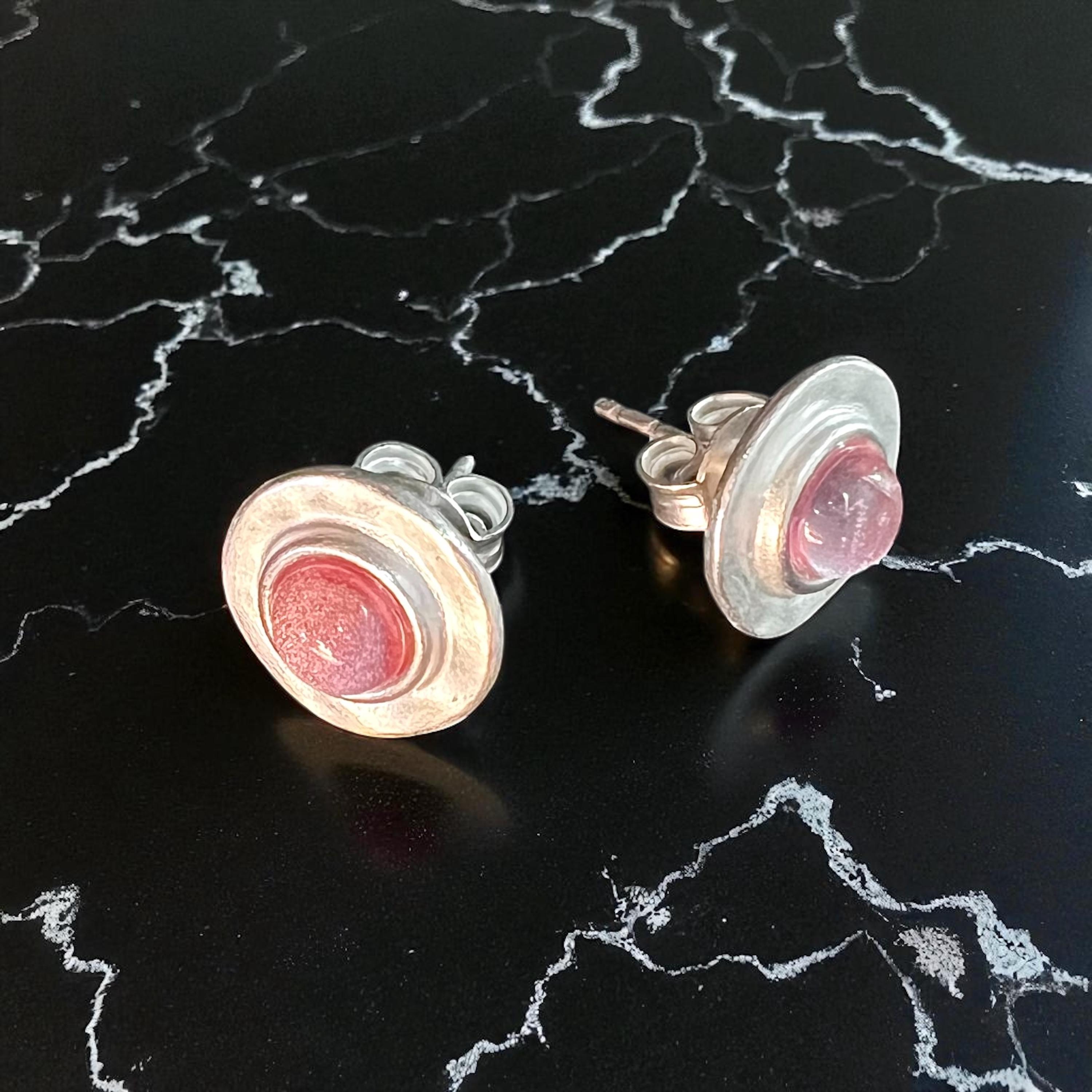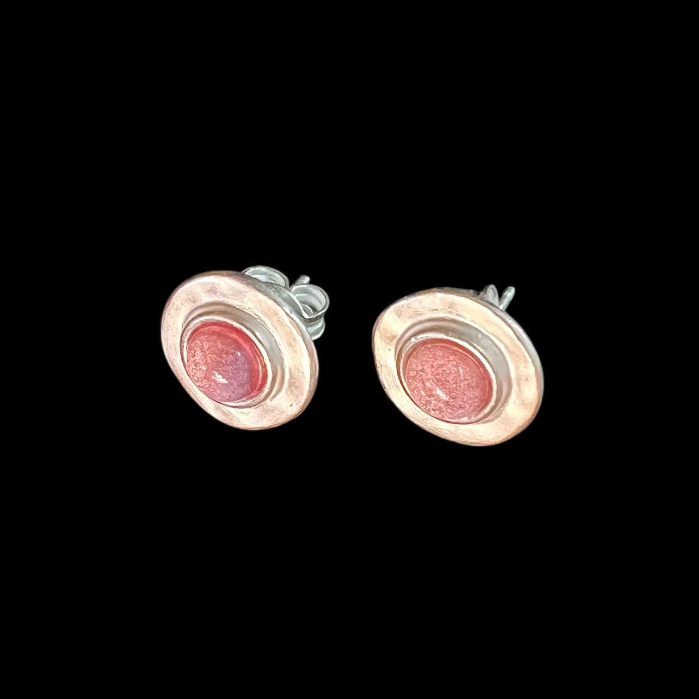 Beautiful pink North Sea silver stud earrings with a hammered finish. Round, hammered earrings, total diameter approx. 11 mm, with a luminous glass stone with silver leaf, size approx. 5 mm.