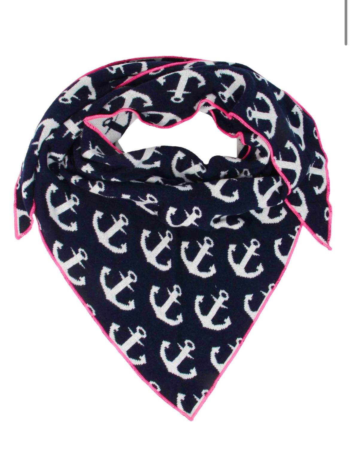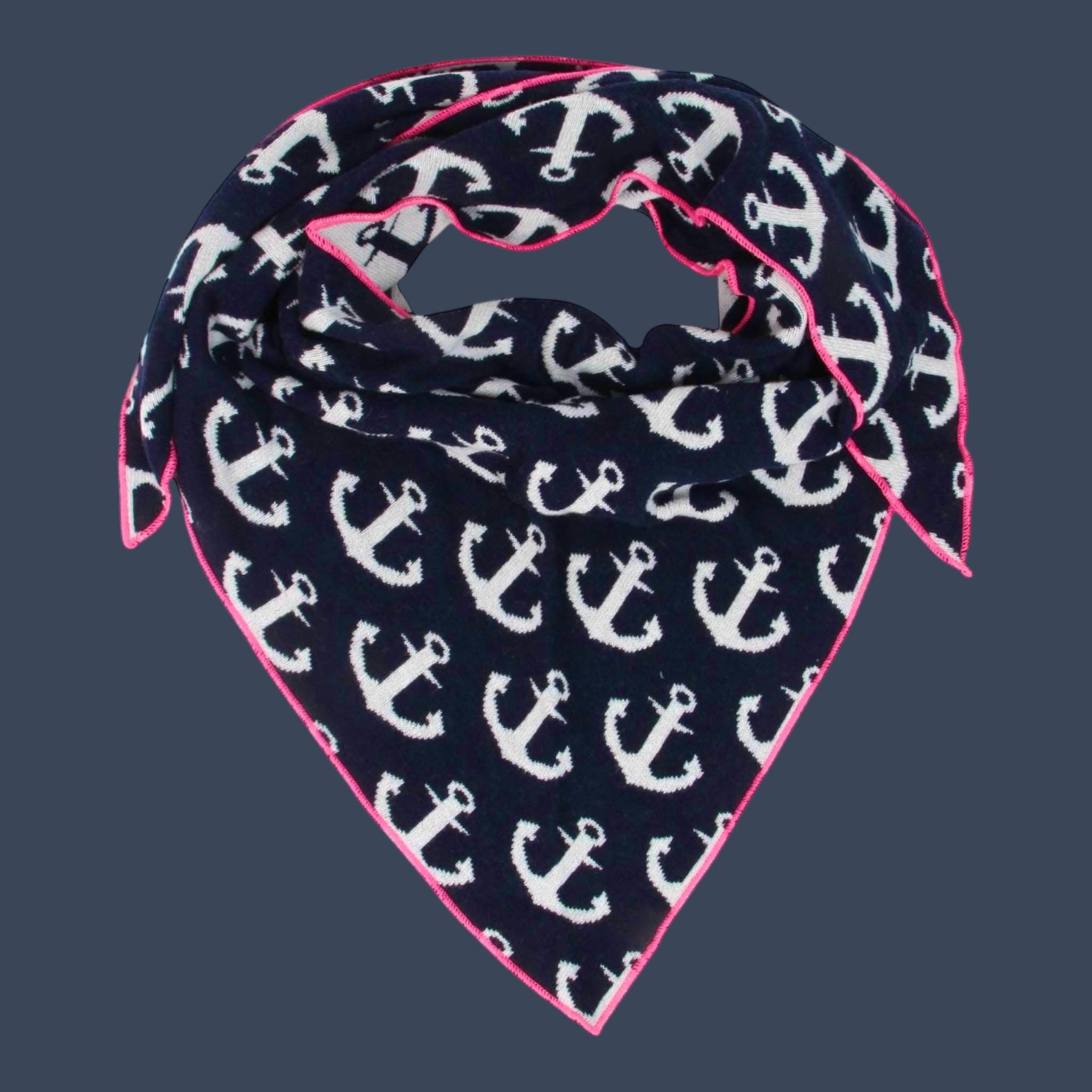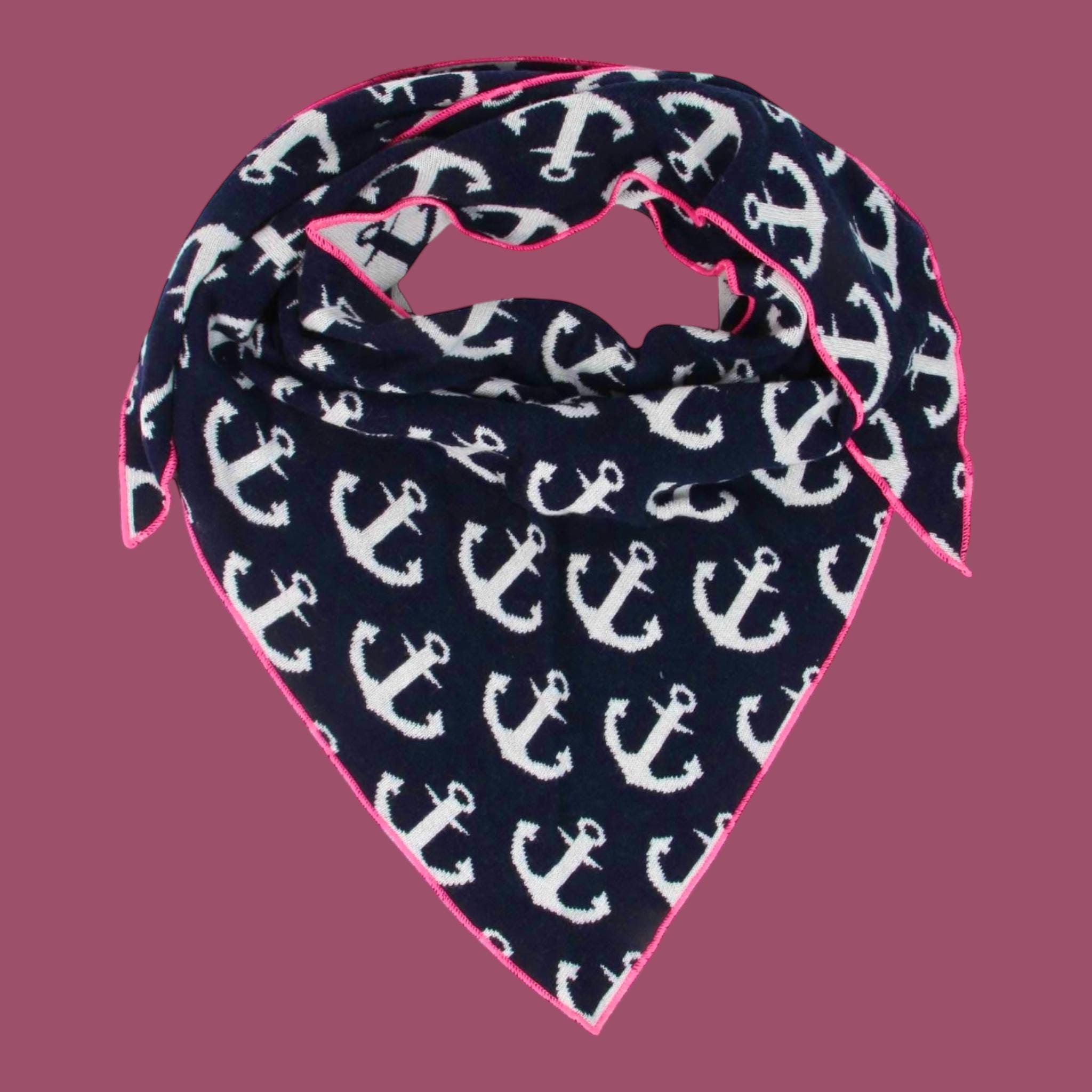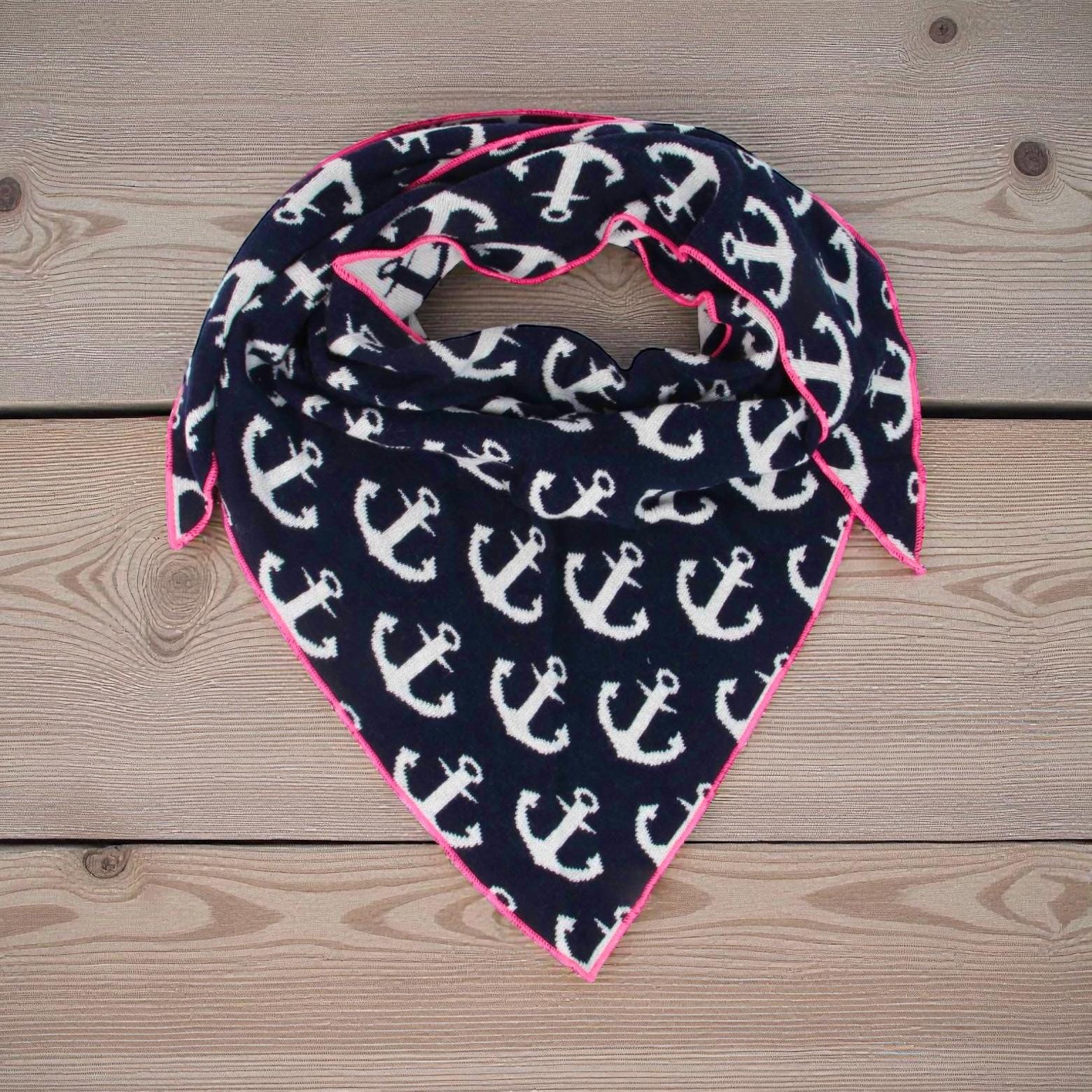 Cuddle up nicely with our large, soft triangular scarf for cold autumn and winter days, featuring anchors. Guaranteed to keep out the wind. A great nautical triangular scarf for carefree days by the sea. This large wool scarf can also be worn over the shoulder.