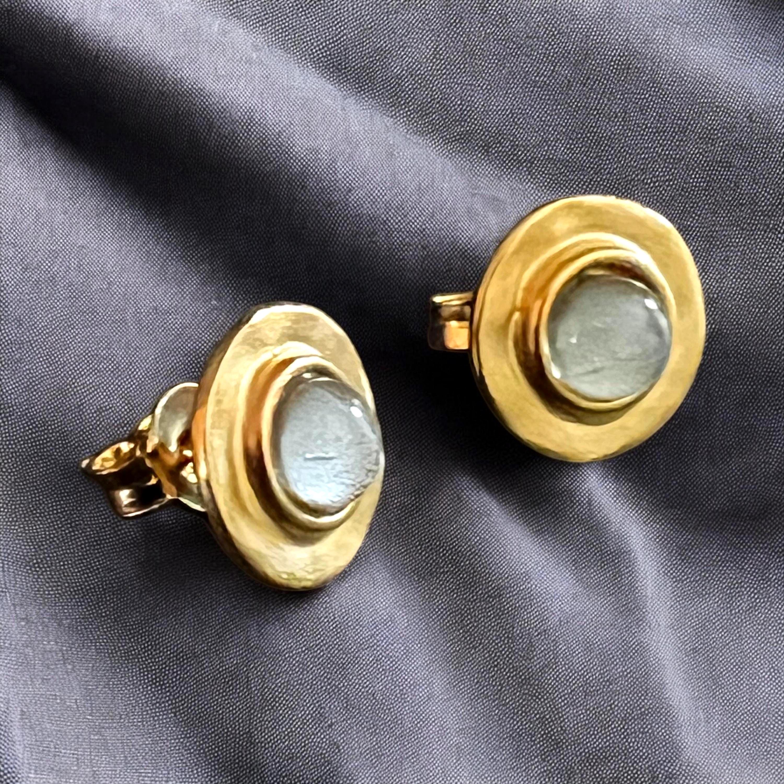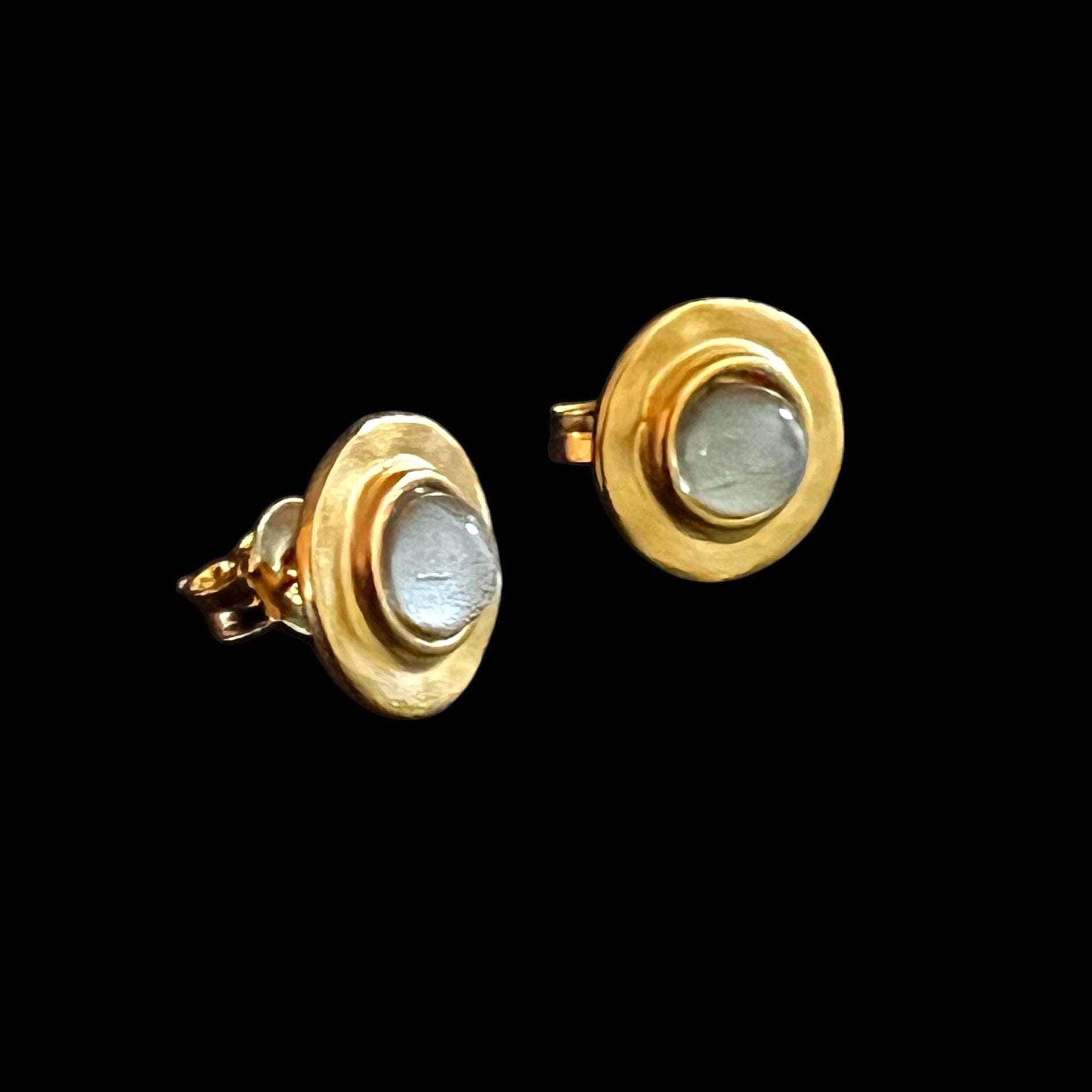 The earrings are also in a round, hammered look, with a total diameter of approximately 11 mm and a luminous glass stone with silver leaf, approximately 5 mm in size.