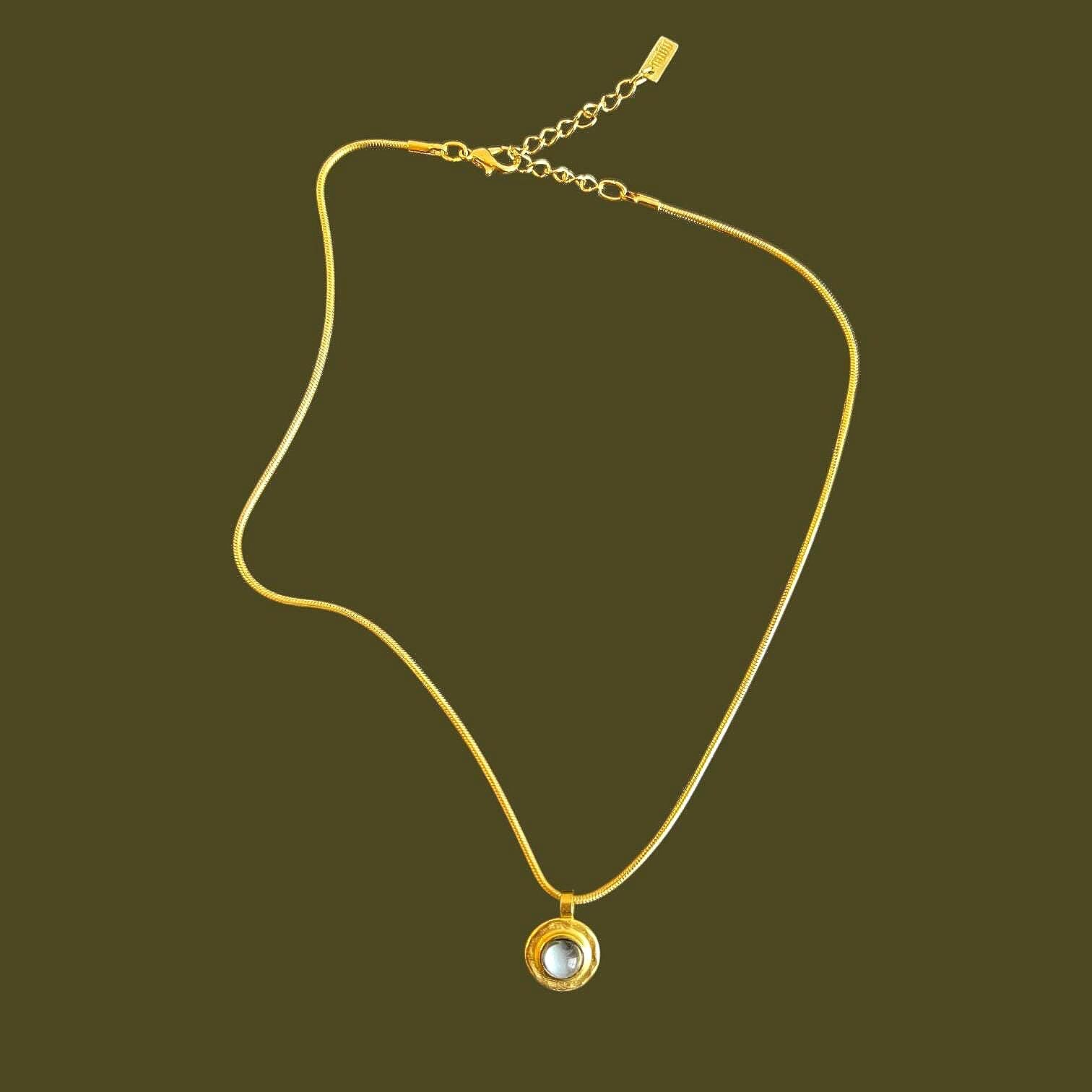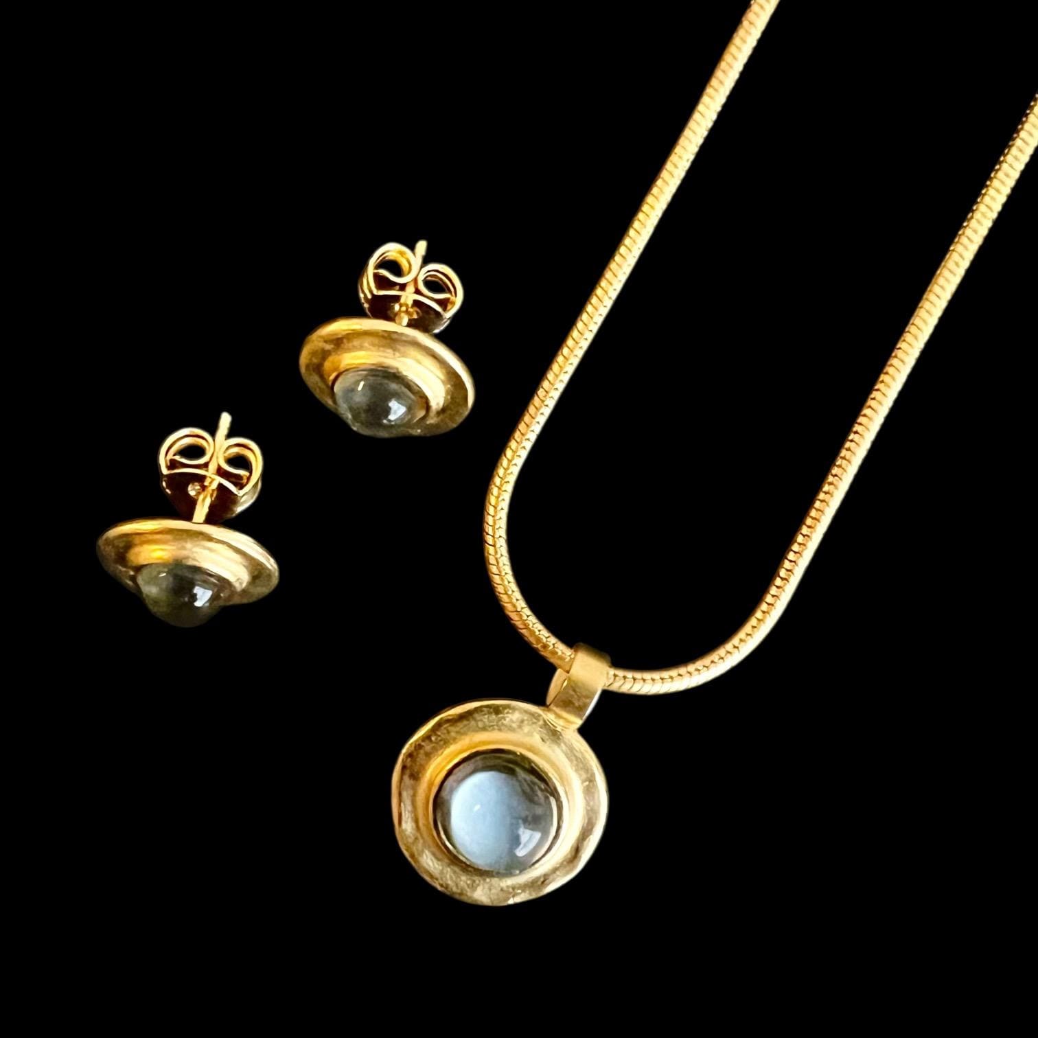 A beautiful set consisting of a Baltic gold snake chain necklace with a round pendant featuring a hammered-effect glass stone and matching stud earrings. The pendant has a diameter of approximately 13 mm and a luminous glass stone, approximately 5 mm in size, adorned with silver leaf. The silver leaf finish gives the glass stone a wonderful brilliance.
