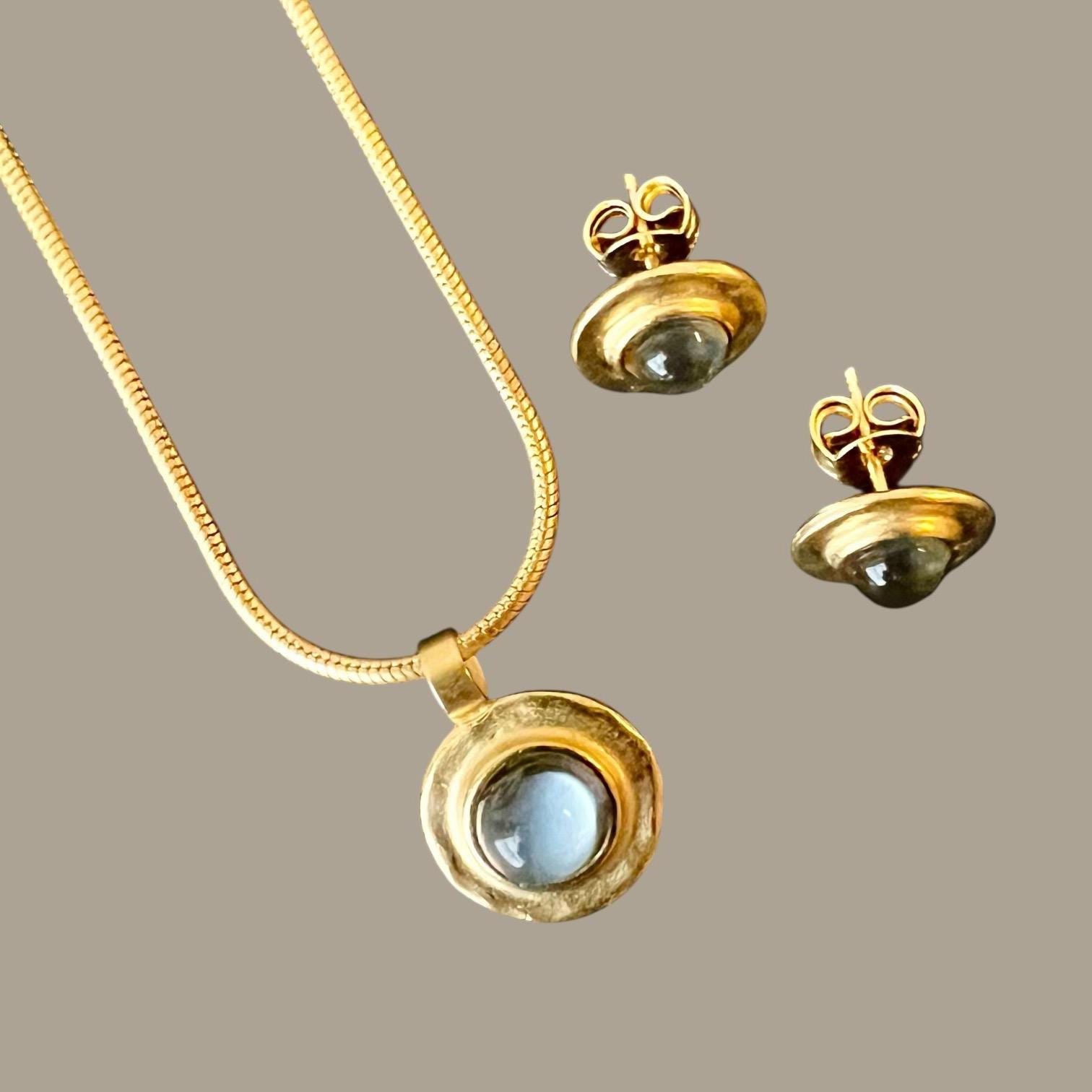 Ebb and Flow Necklace & Earrings Baltic Gold Grey - Set: Snake chain 22K matte gold plated, round pendant, earrings Baltic Gold grey