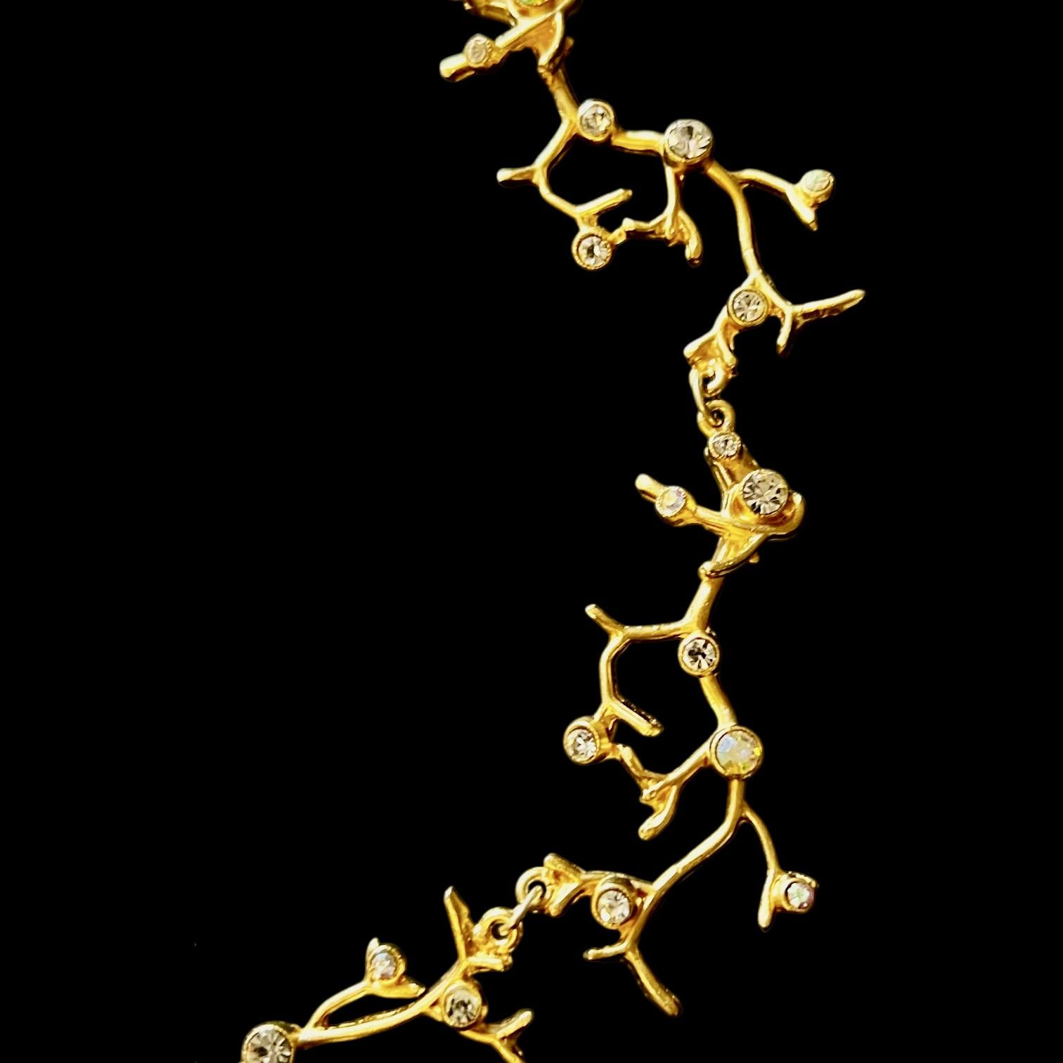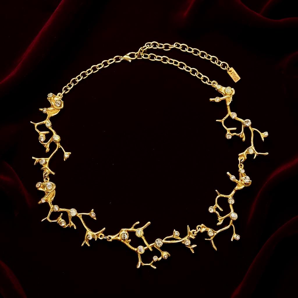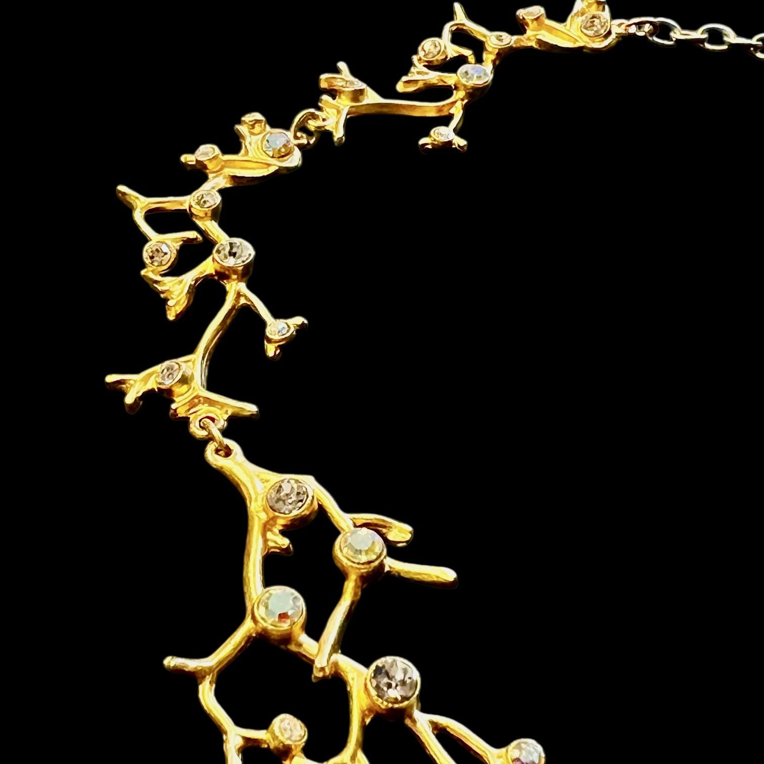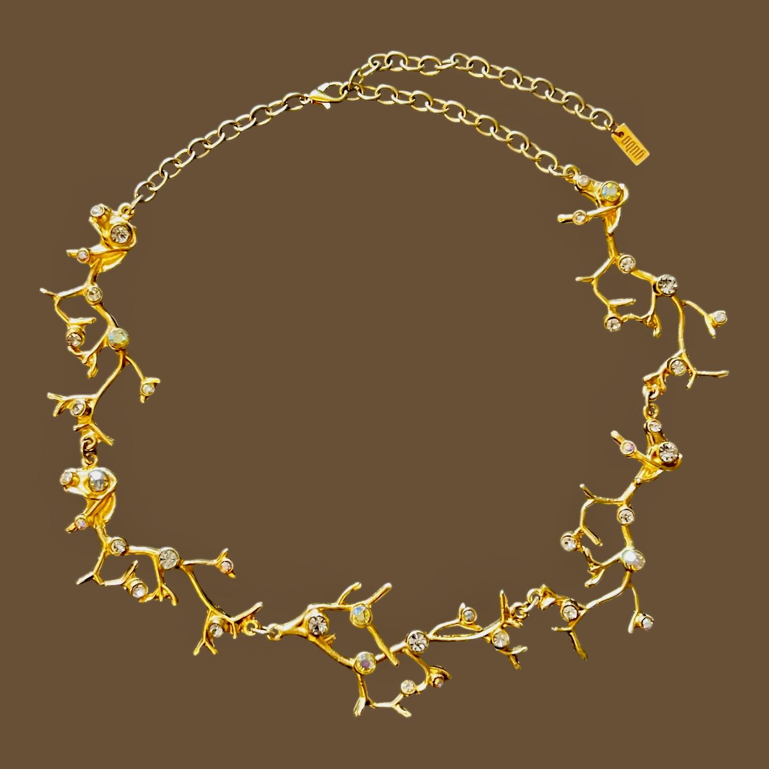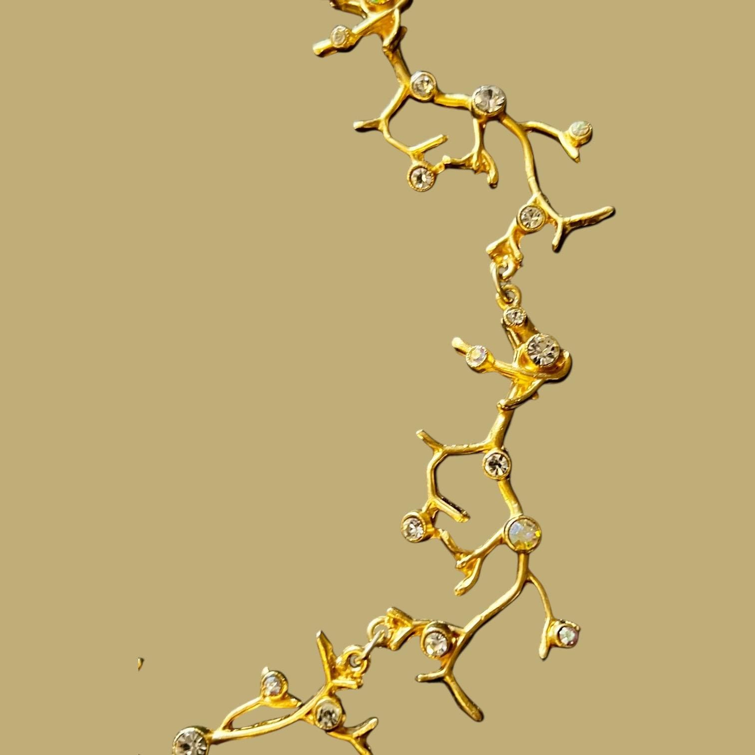 Das Collier besteht aus 5 astförmigen Elementen mit kleinen leuchtenden Glassteinen, die Gliederkette ist beliebig verstellbar, die Gesamtlänge beträgt ca. 50 cm, sie ist 22 Karat matt vergoldet und anlaufgeschützt.