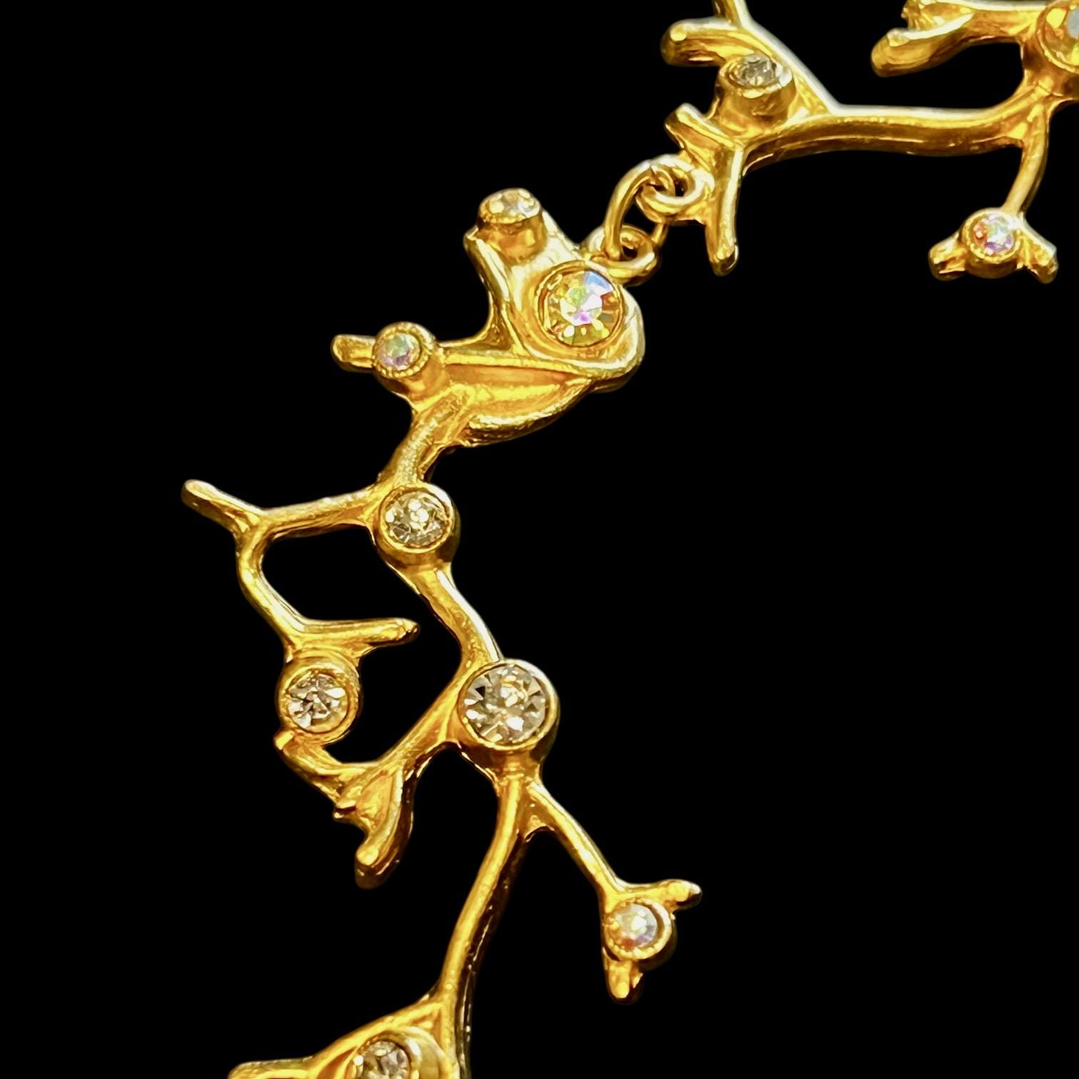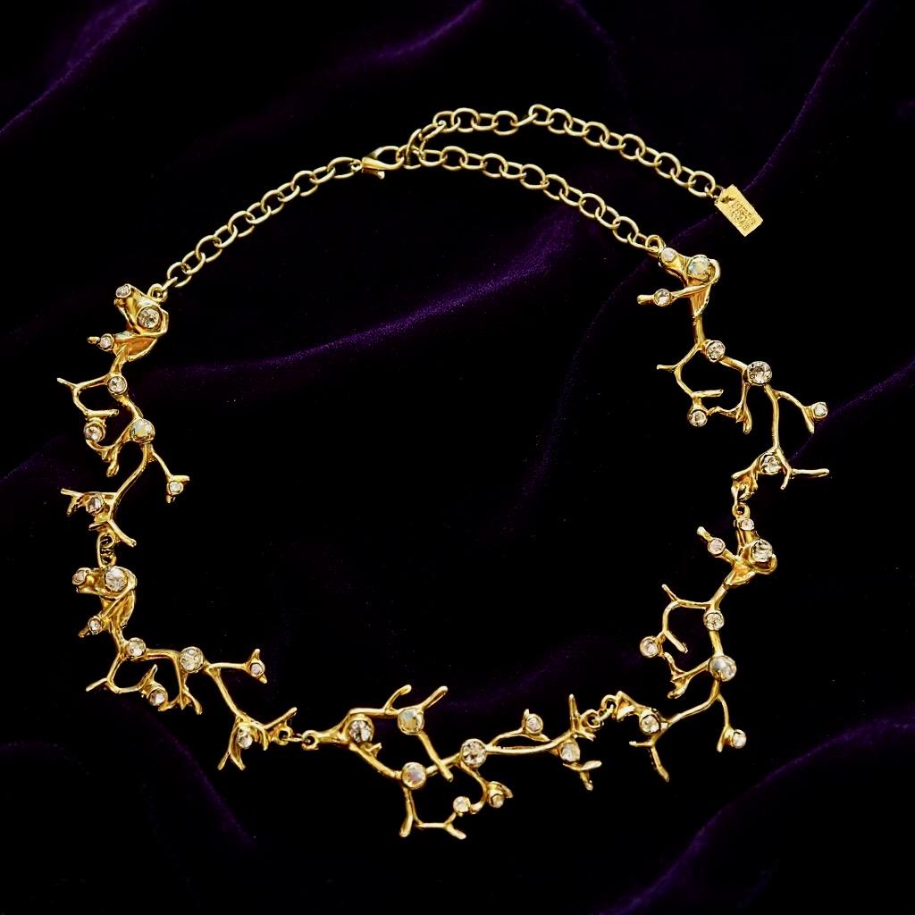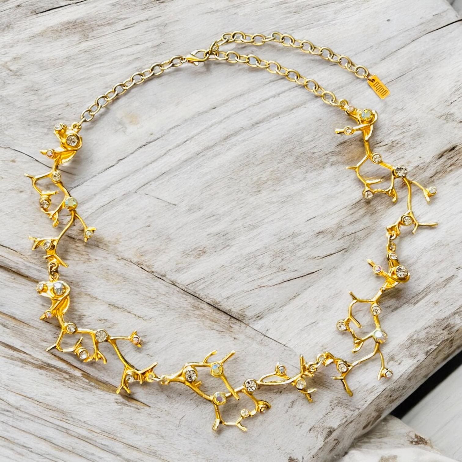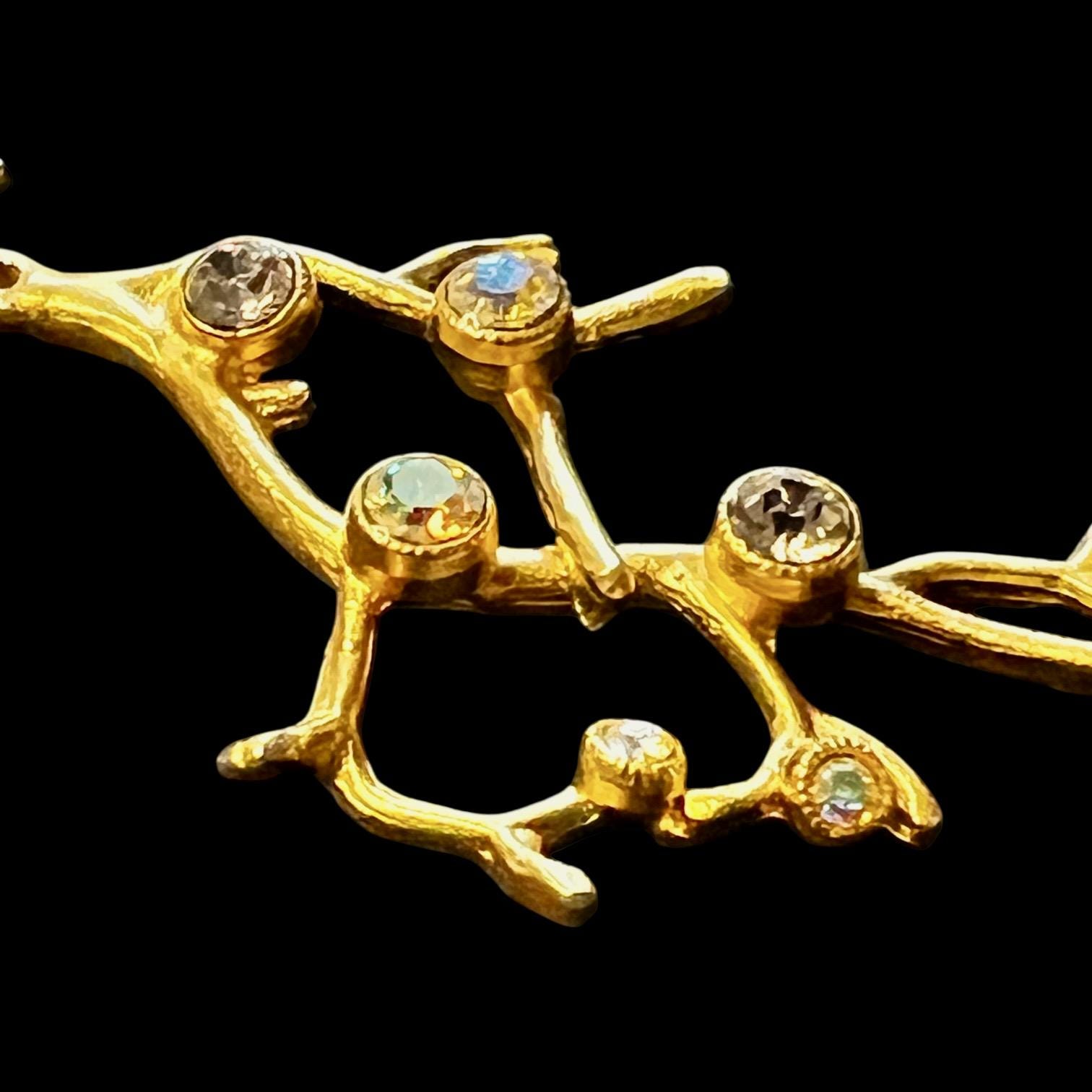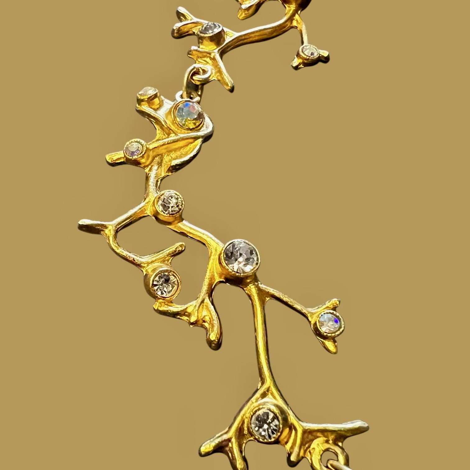 Das Collier besteht aus 5 astförmigen Elementen mit kleinen leuchtenden Glassteinen, die Gliederkette ist beliebig verstellbar, die Gesamtlänge beträgt ca. 50 cm, sie ist 22 Karat matt vergoldet und anlaufgeschützt.