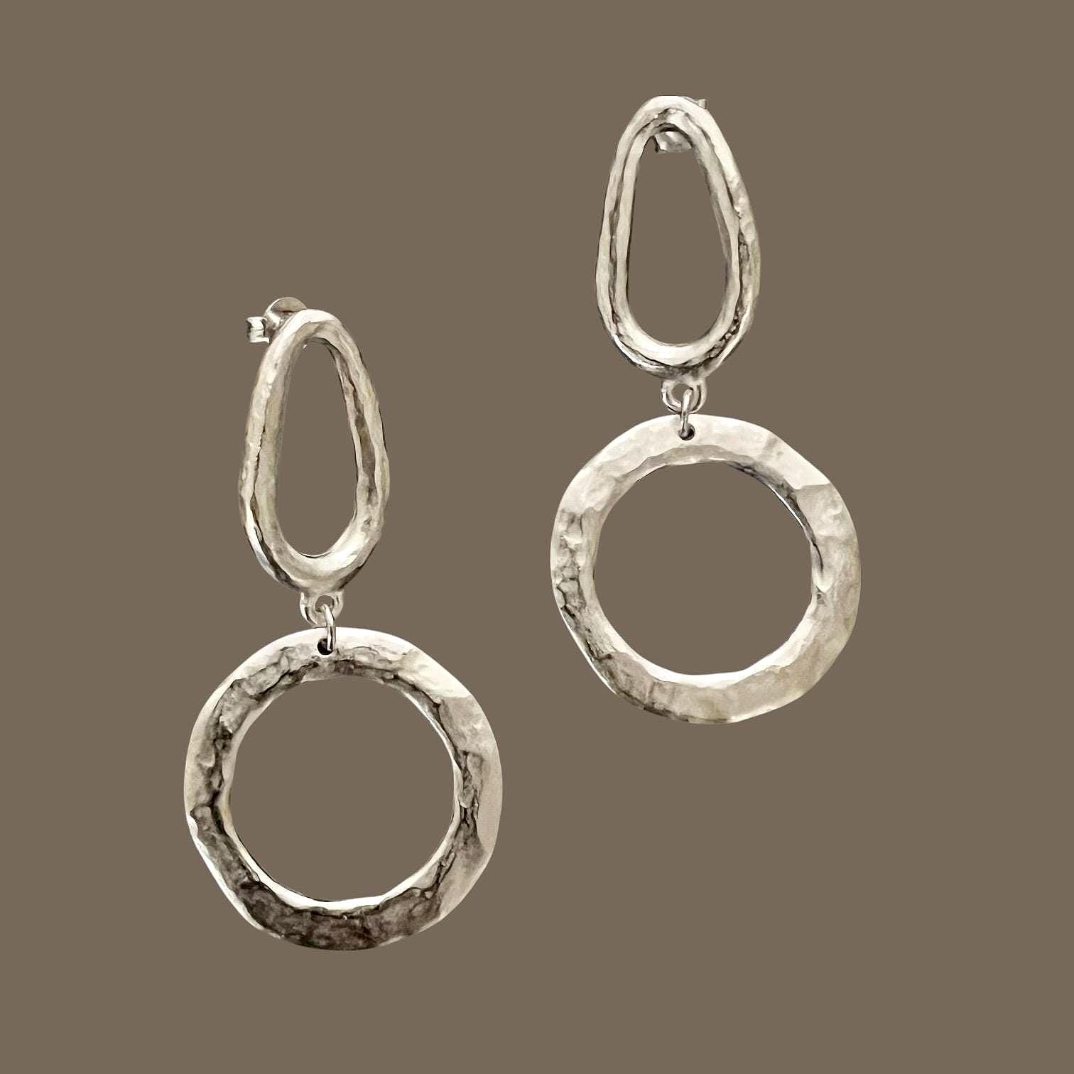 These elegant, handcrafted earrings are a real eye-catcher. With their modern, geometric design—consisting of an oval shape and a round ring—they combine minimalism with artistic expression. The hammered surface gives the earrings a special texture and a refined, artisanal feel.