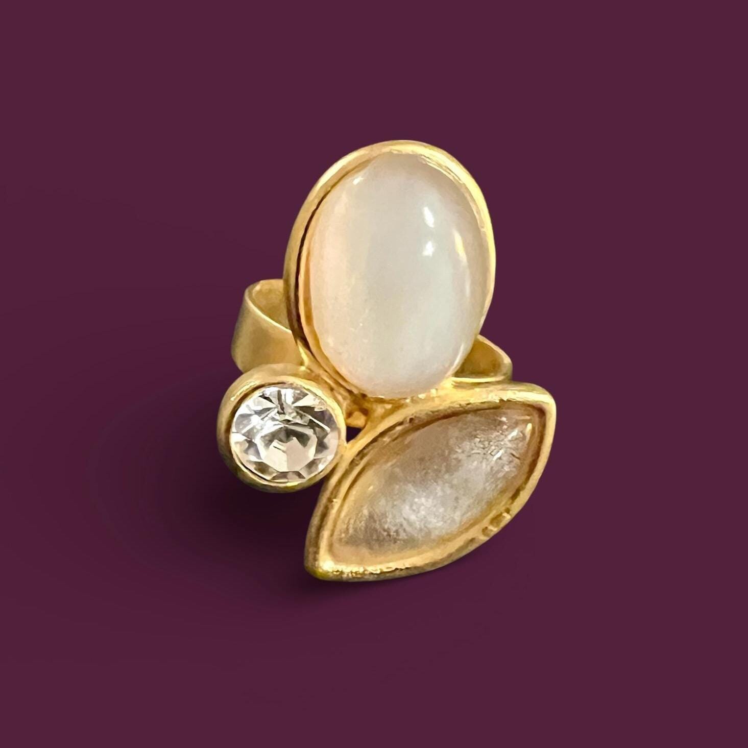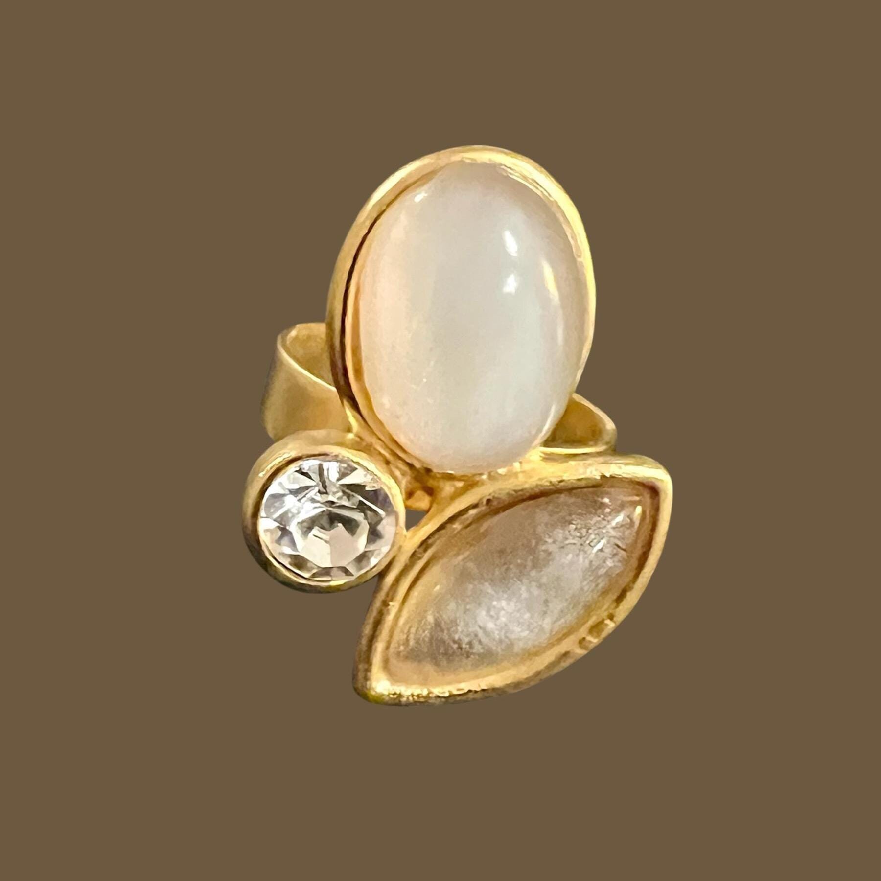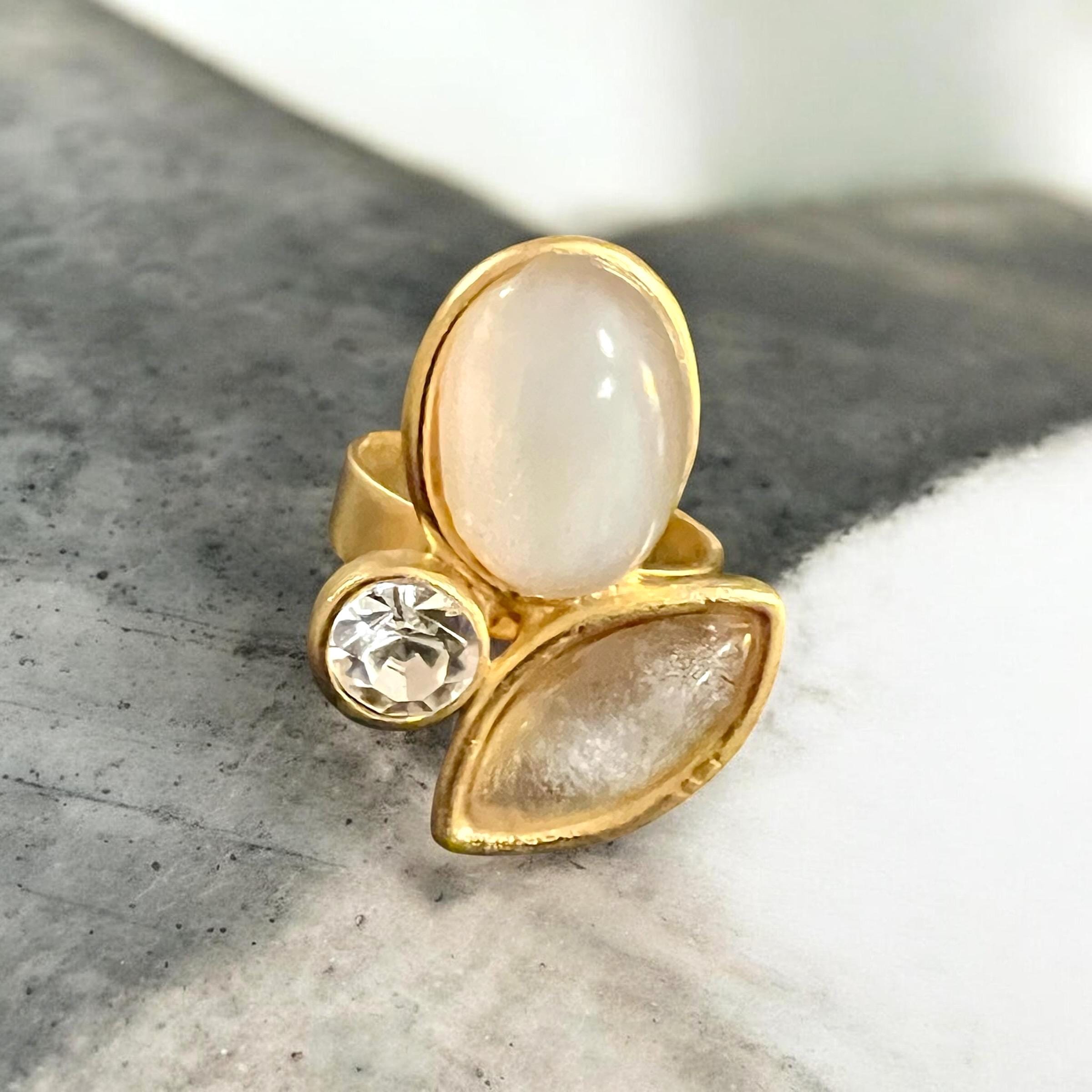 A stunning statement ring in elegant Baltic gold with handcrafted glass stones in white, crystal, and light gray for a unique look. The ring is adjustable. A beautiful jewelry gift for her.