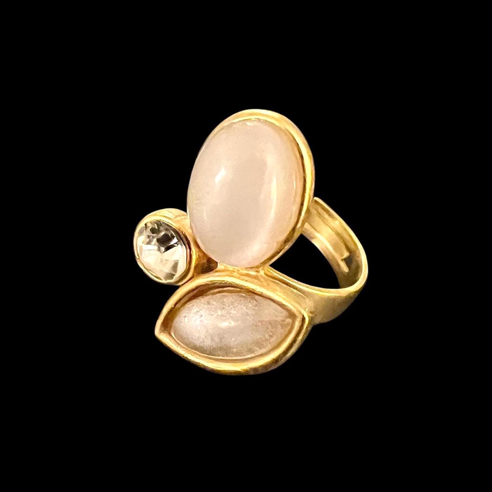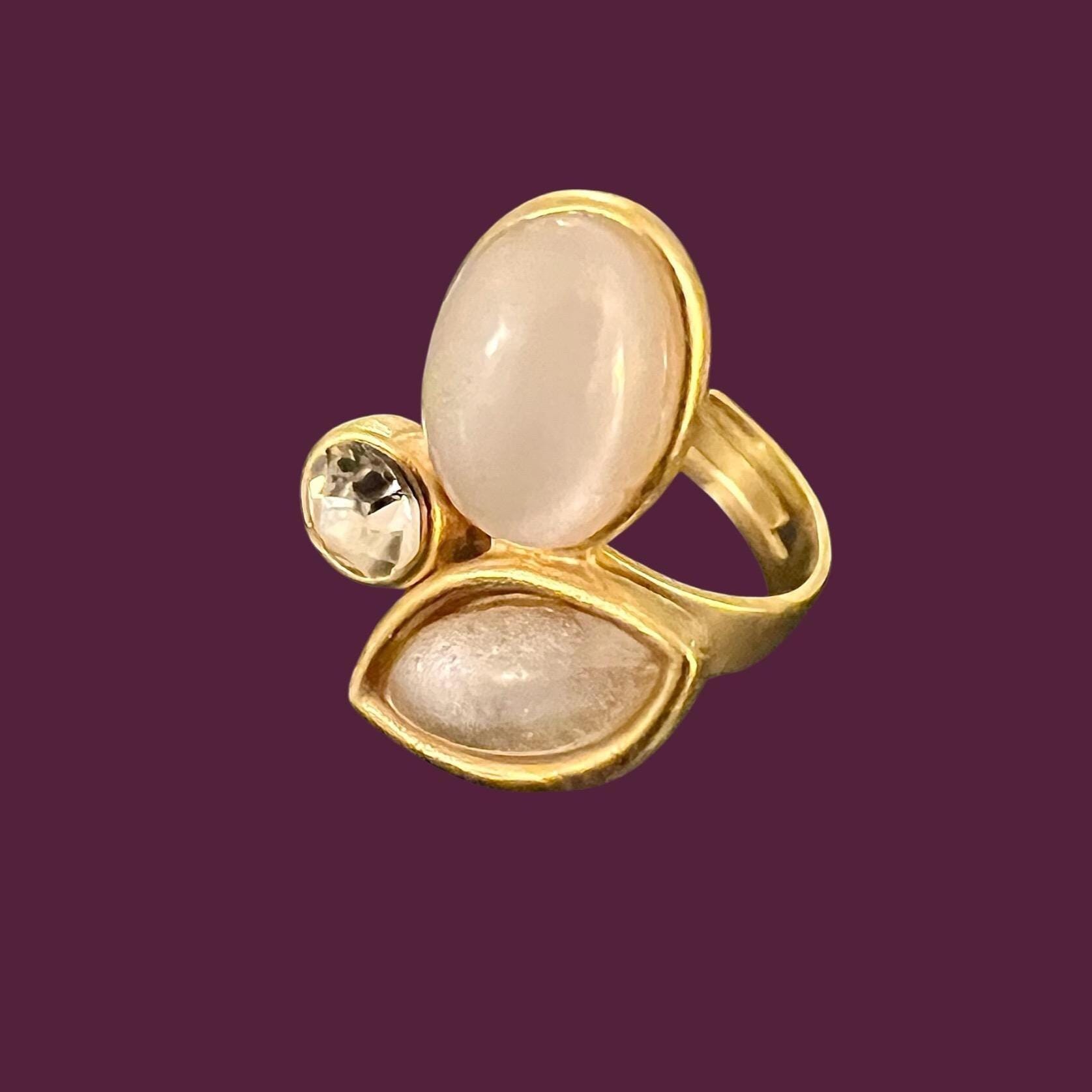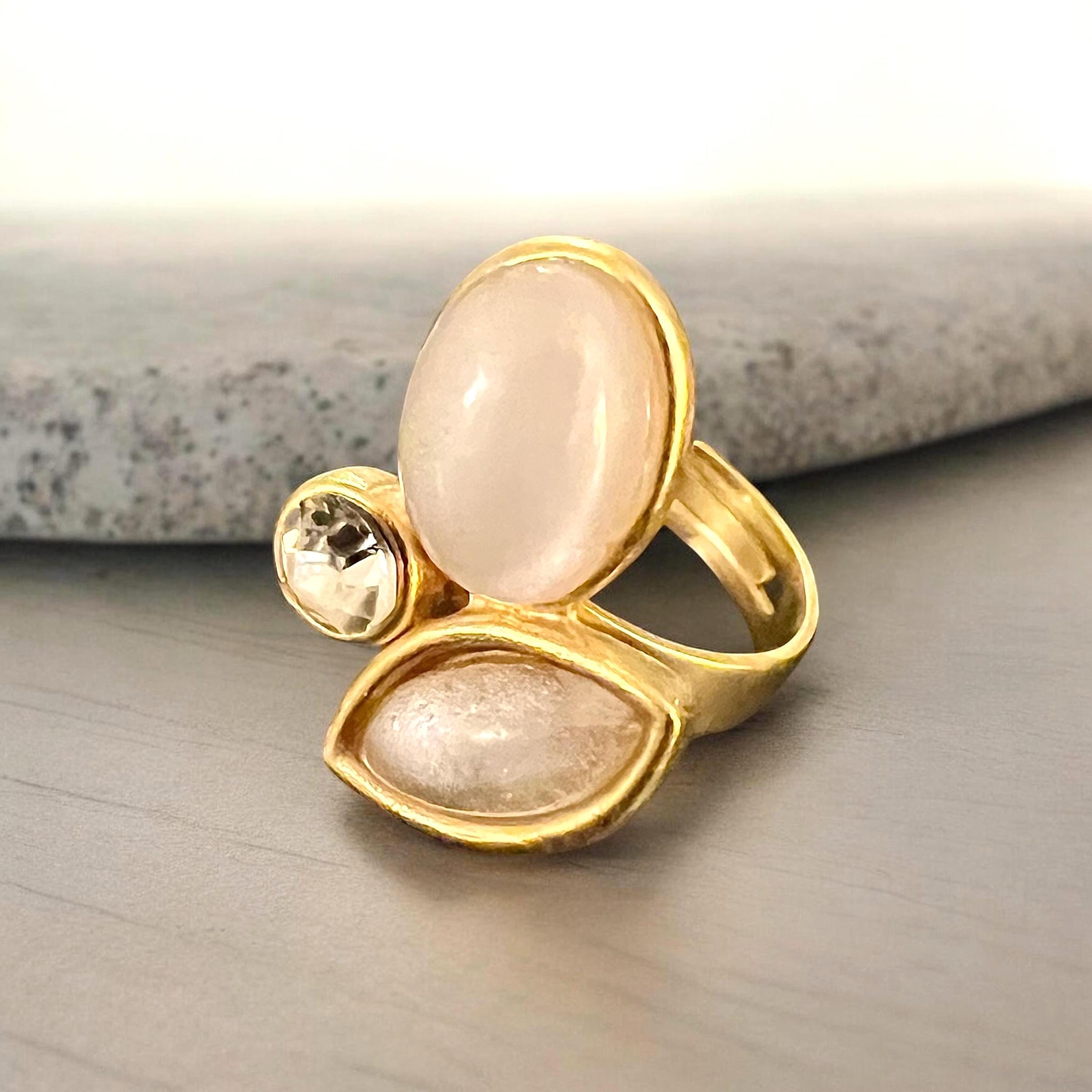 A stunning statement ring in elegant Baltic gold with handcrafted glass stones in white, crystal, and light gray for a unique look. The ring is adjustable. A beautiful jewelry gift for her.