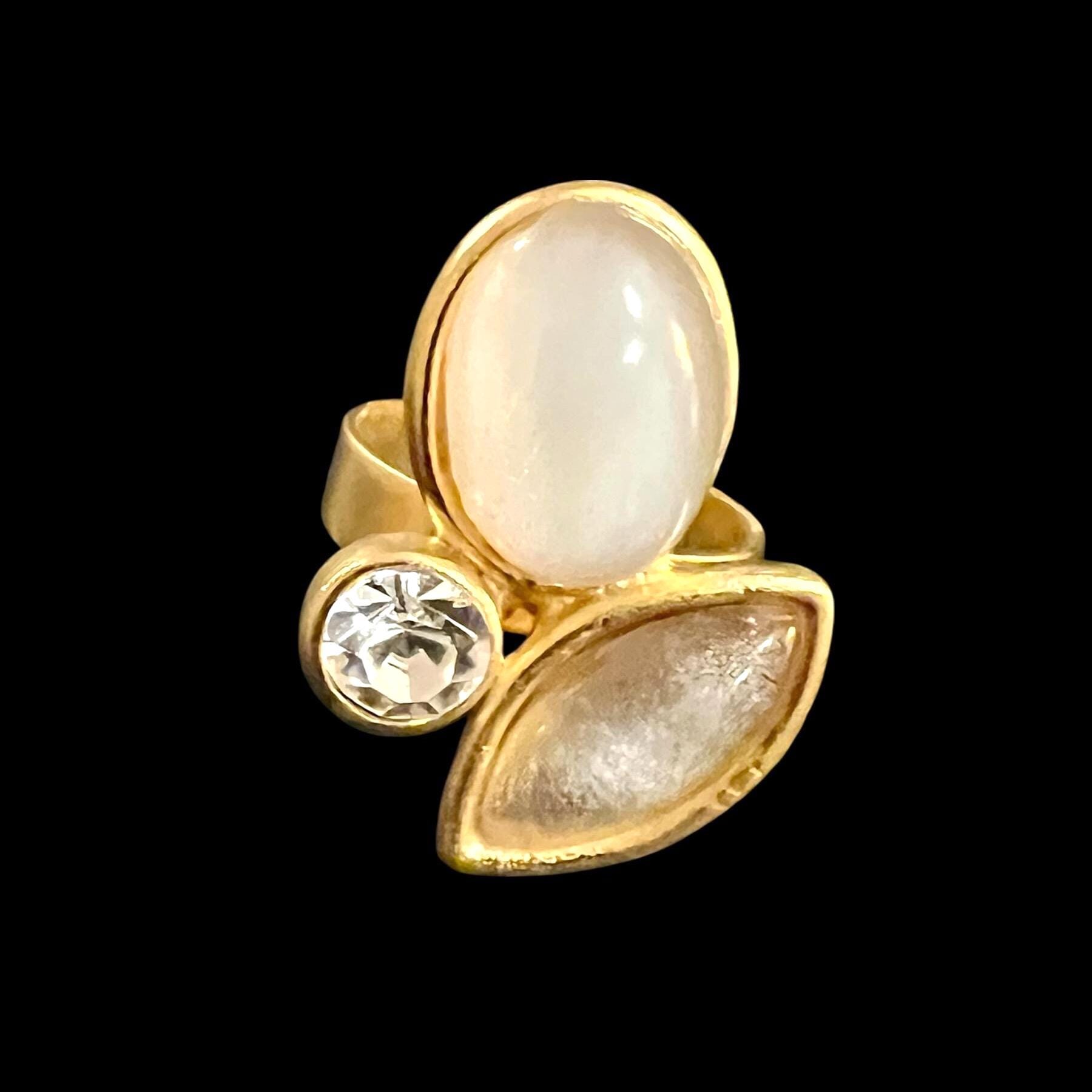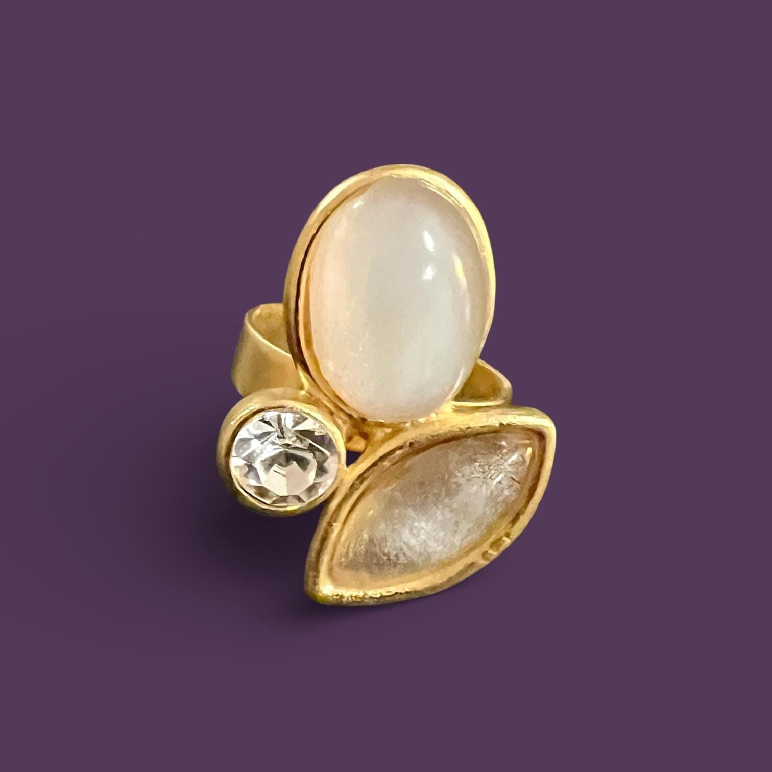 Ebb and Flow Statement Ring Baltic Gold - Round 22K matte gold plated with white and light grey glass stones with silver leaf and opal effect