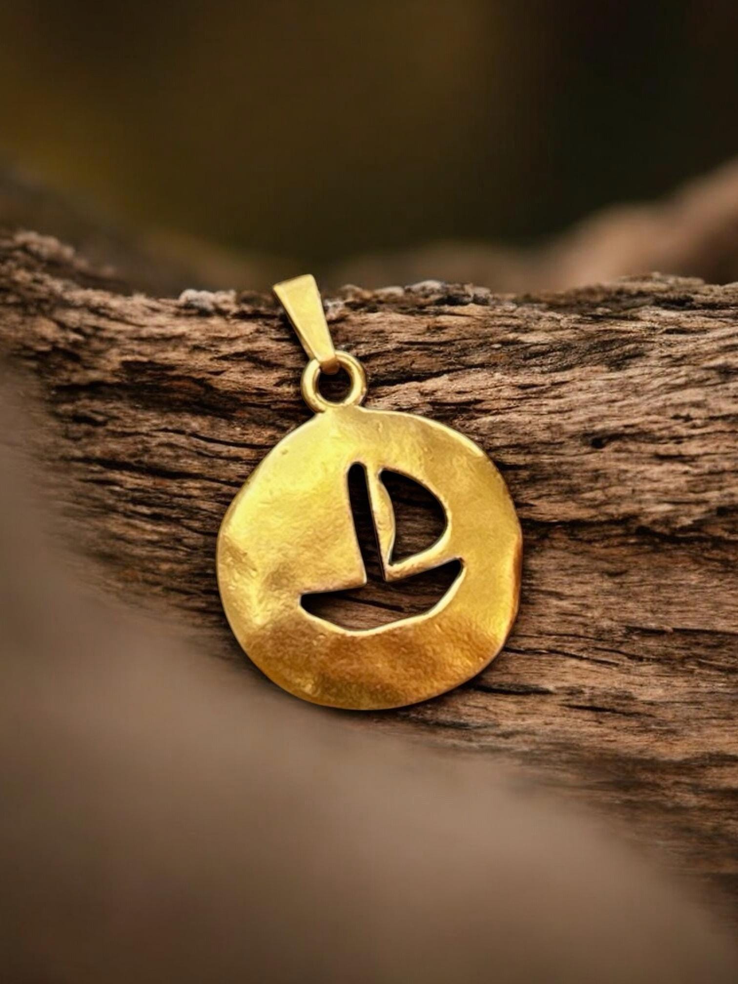 This round pendant impresses with its minimalist, cut-out sailboat design. The slightly textured, hammered surface gives the piece a natural, handcrafted look and makes each one unique.