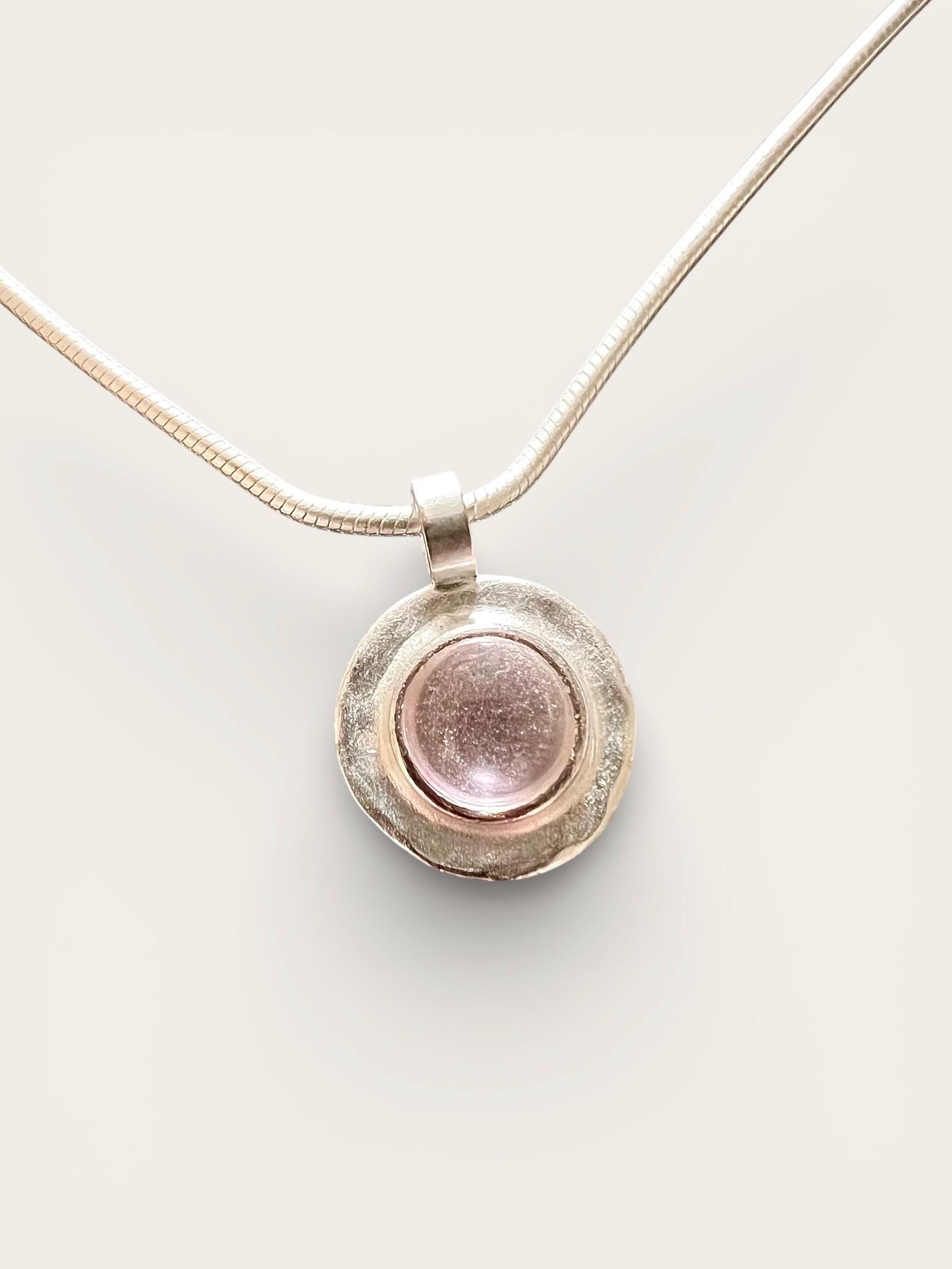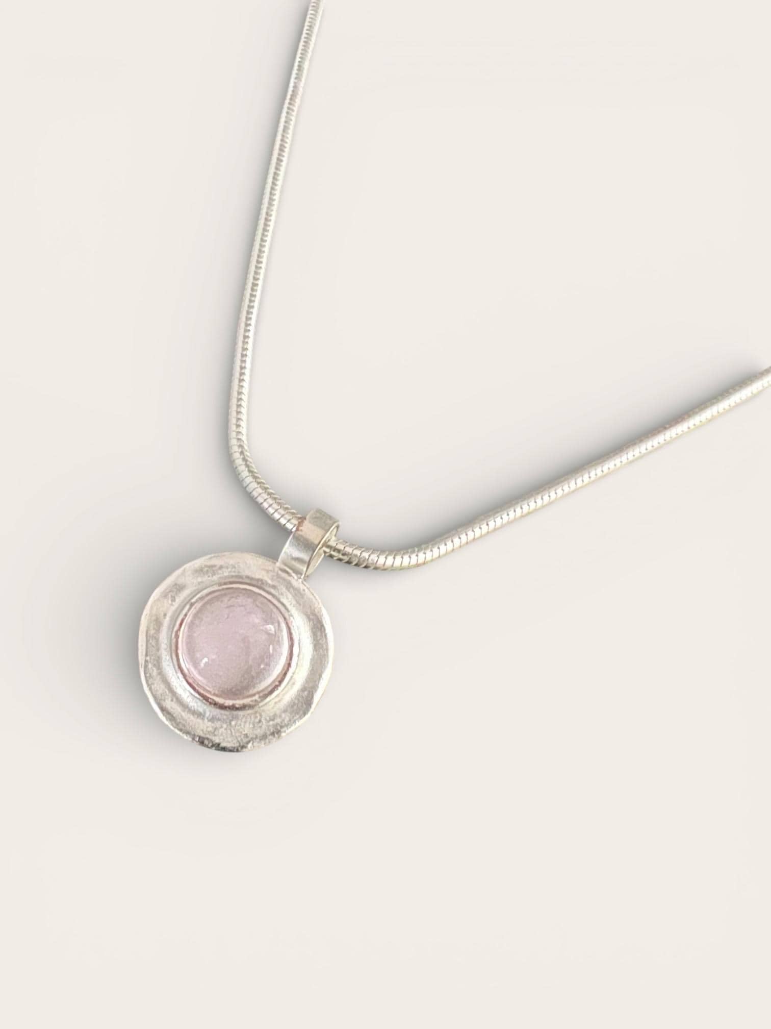 Beautiful North Sea silver snake chain necklace with a round pendant featuring a hammered glass stone. The pendant has a diameter of approximately 13 mm and a luminous glass stone, approximately 5 mm in size, encased in silver leaf. The silver leaf finish gives the glass stone a wonderful brilliance.
