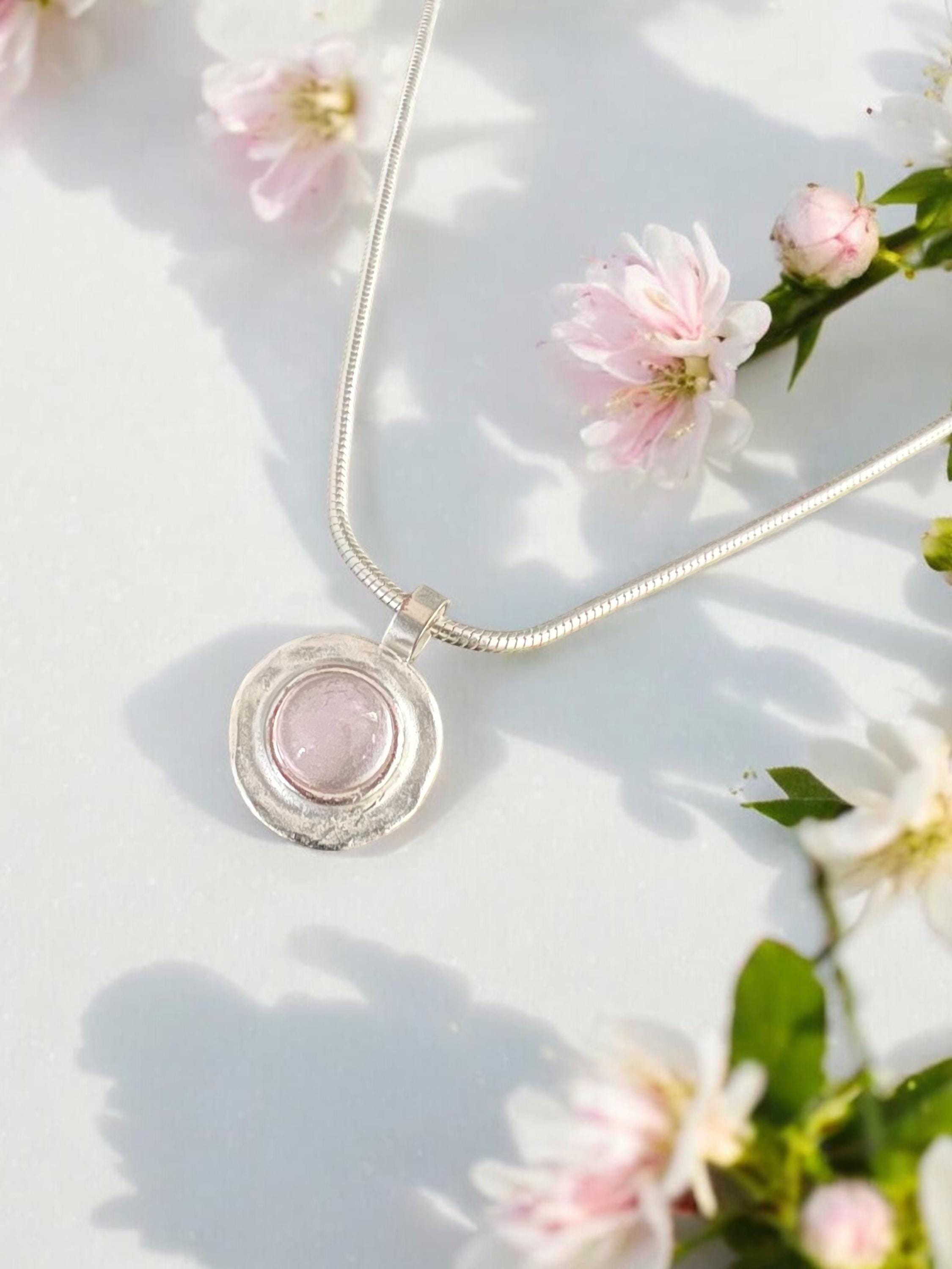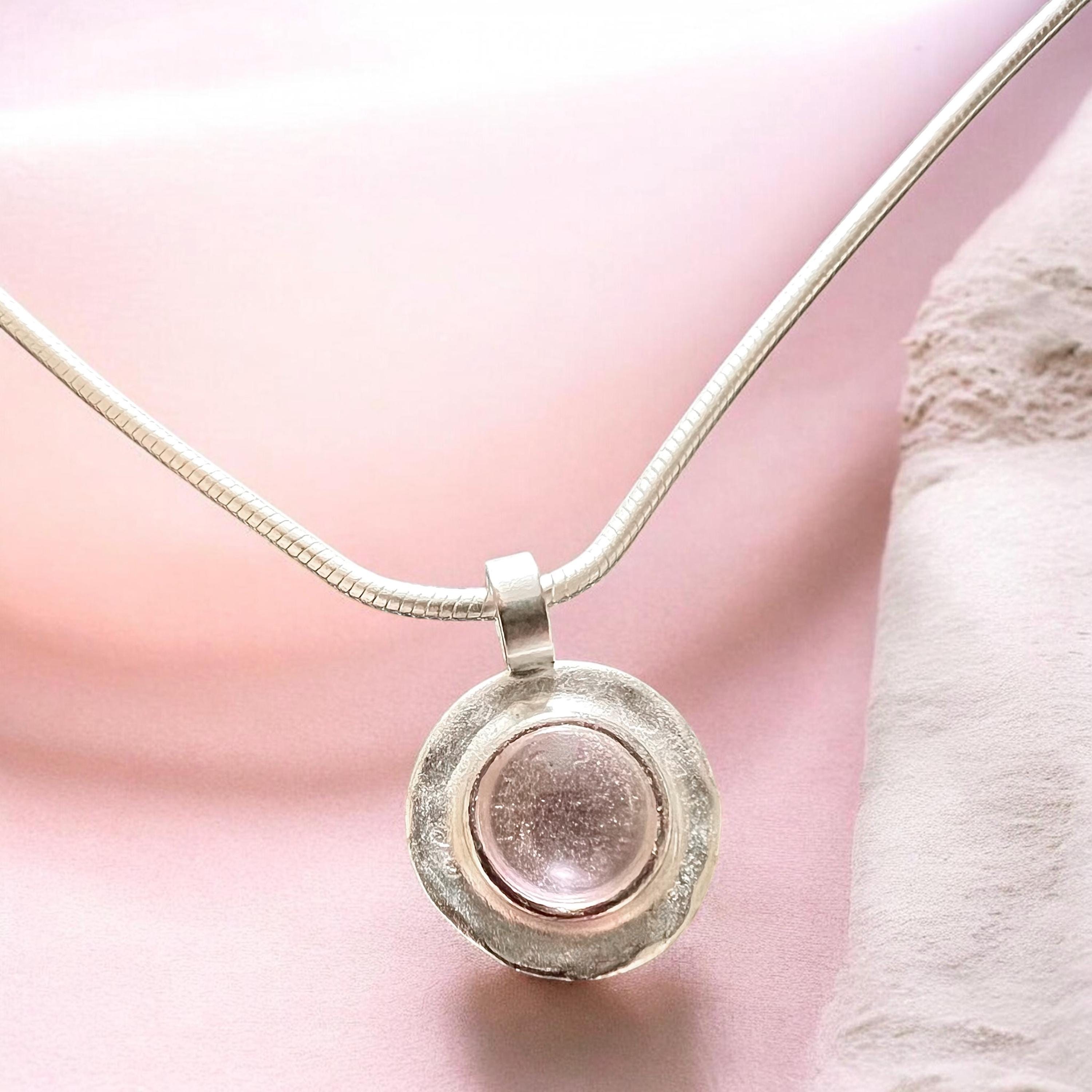 Ebb and Flow Necklace North Sea Silver Pink - Silver-plated snake chain with round pendant, pink glass stone with silver leaf