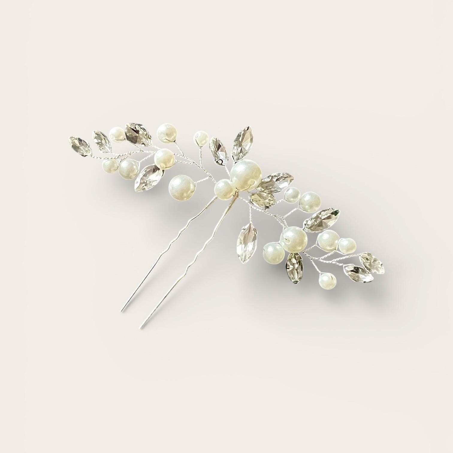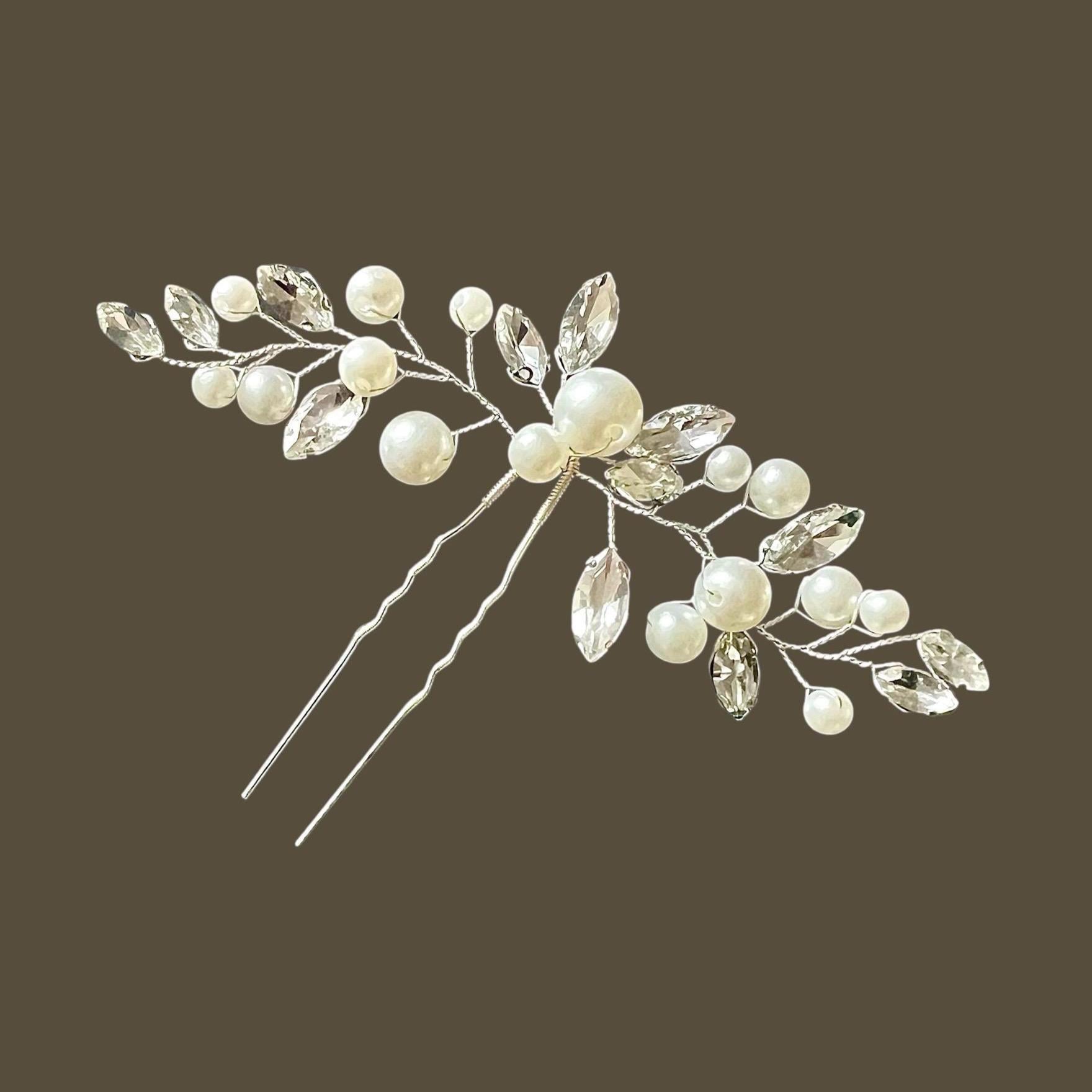 This delicate hairpin, adorned with shimmering pearls and sparkling marquise crystals, adds an elegant, romantic touch to any bridal hairstyle. The subtle branch design blends harmoniously into updos, braids, or loose waves.