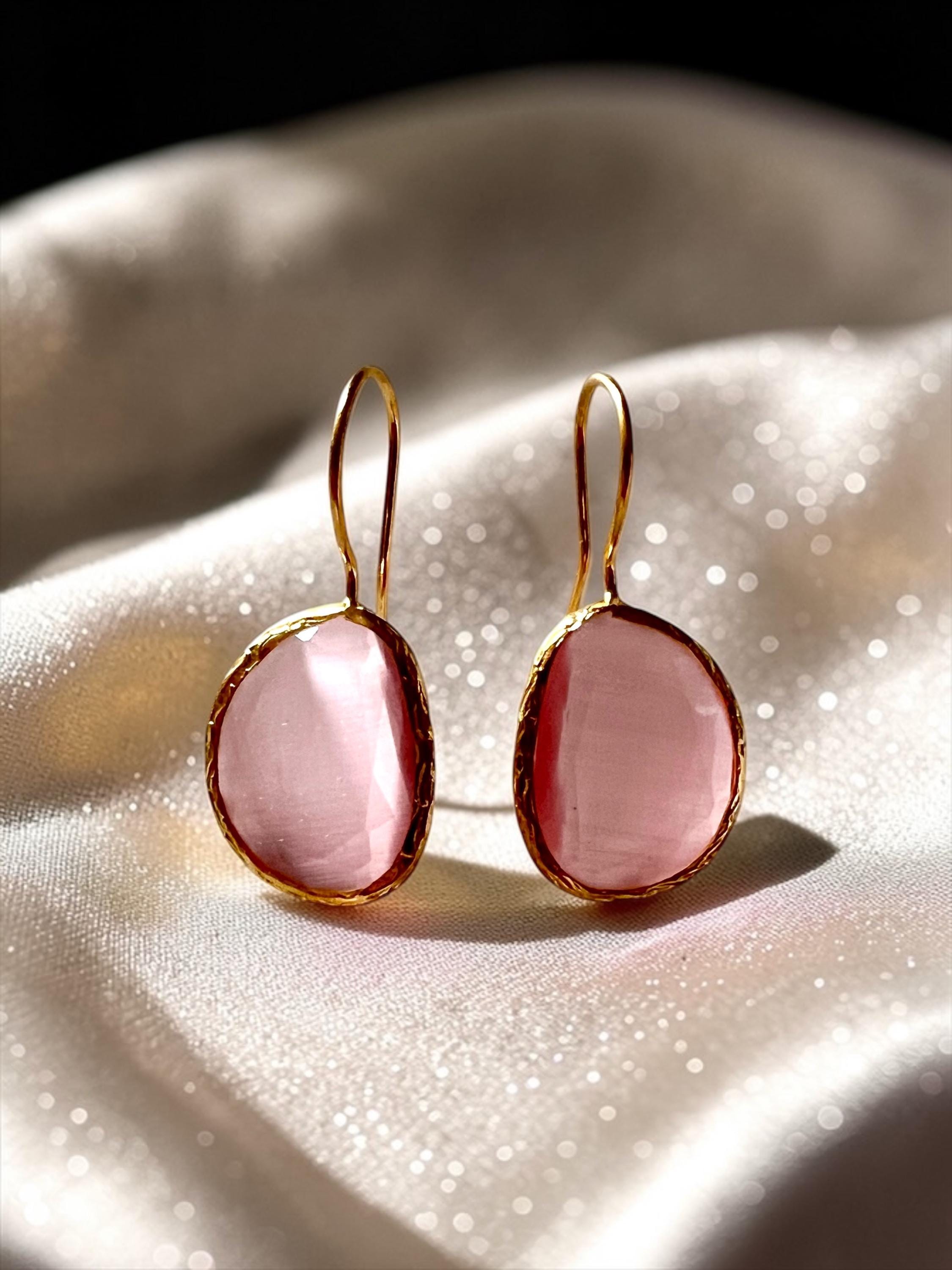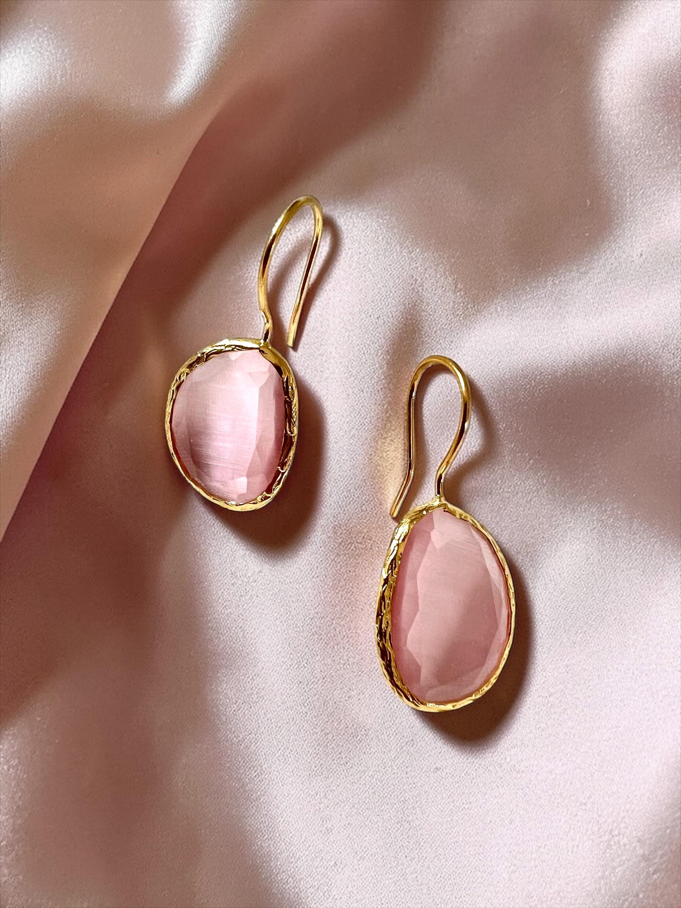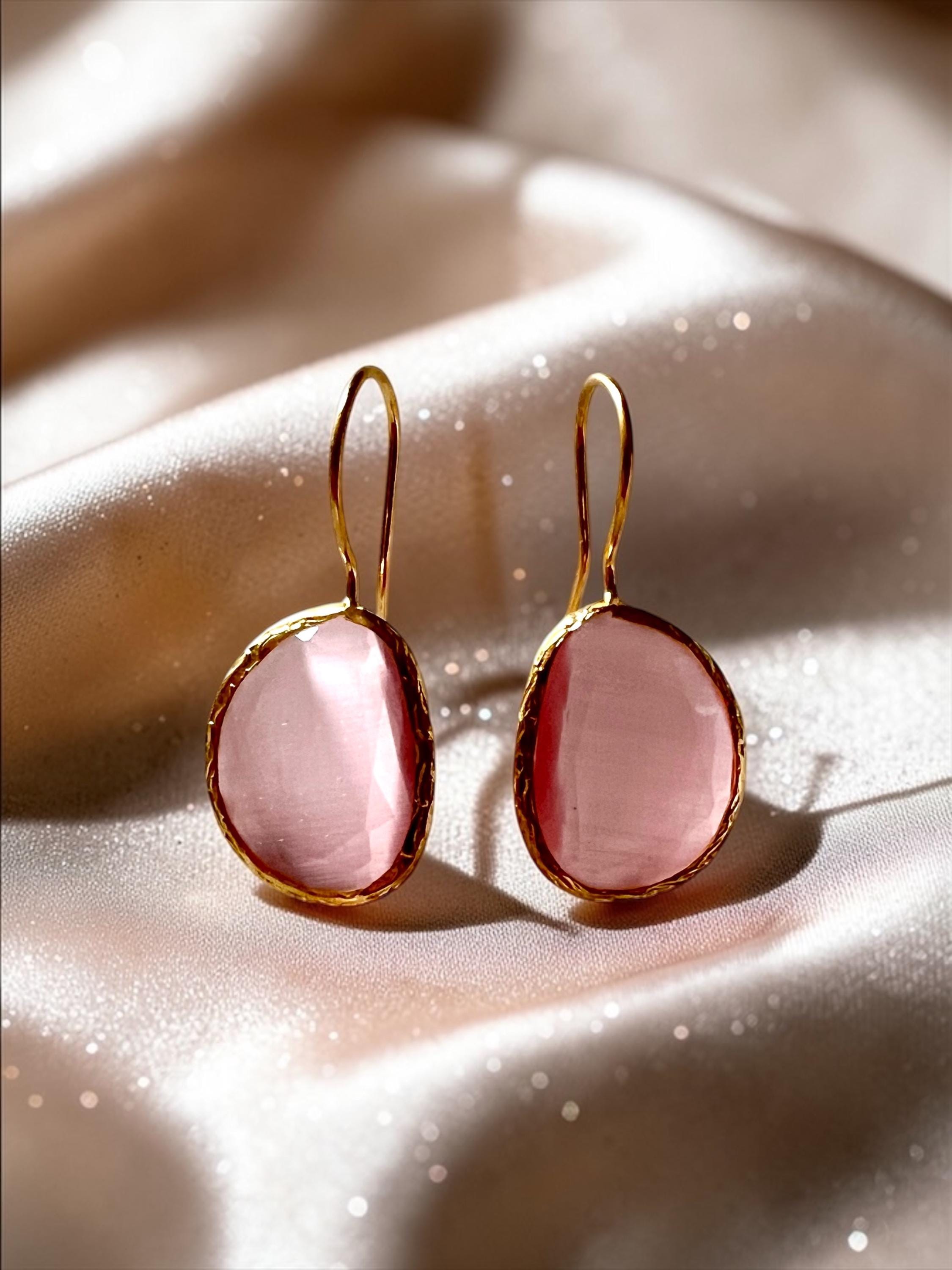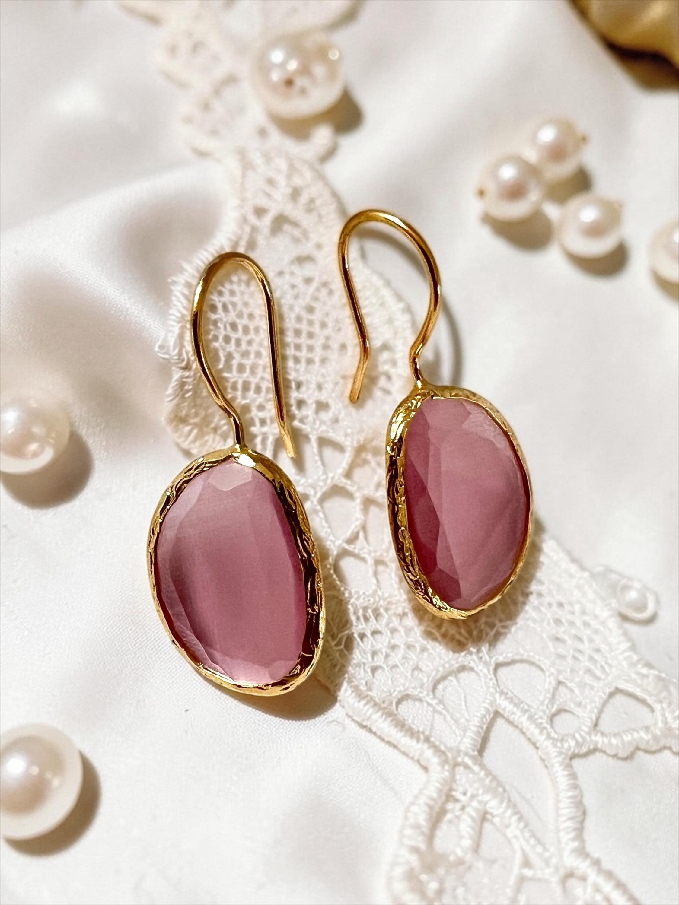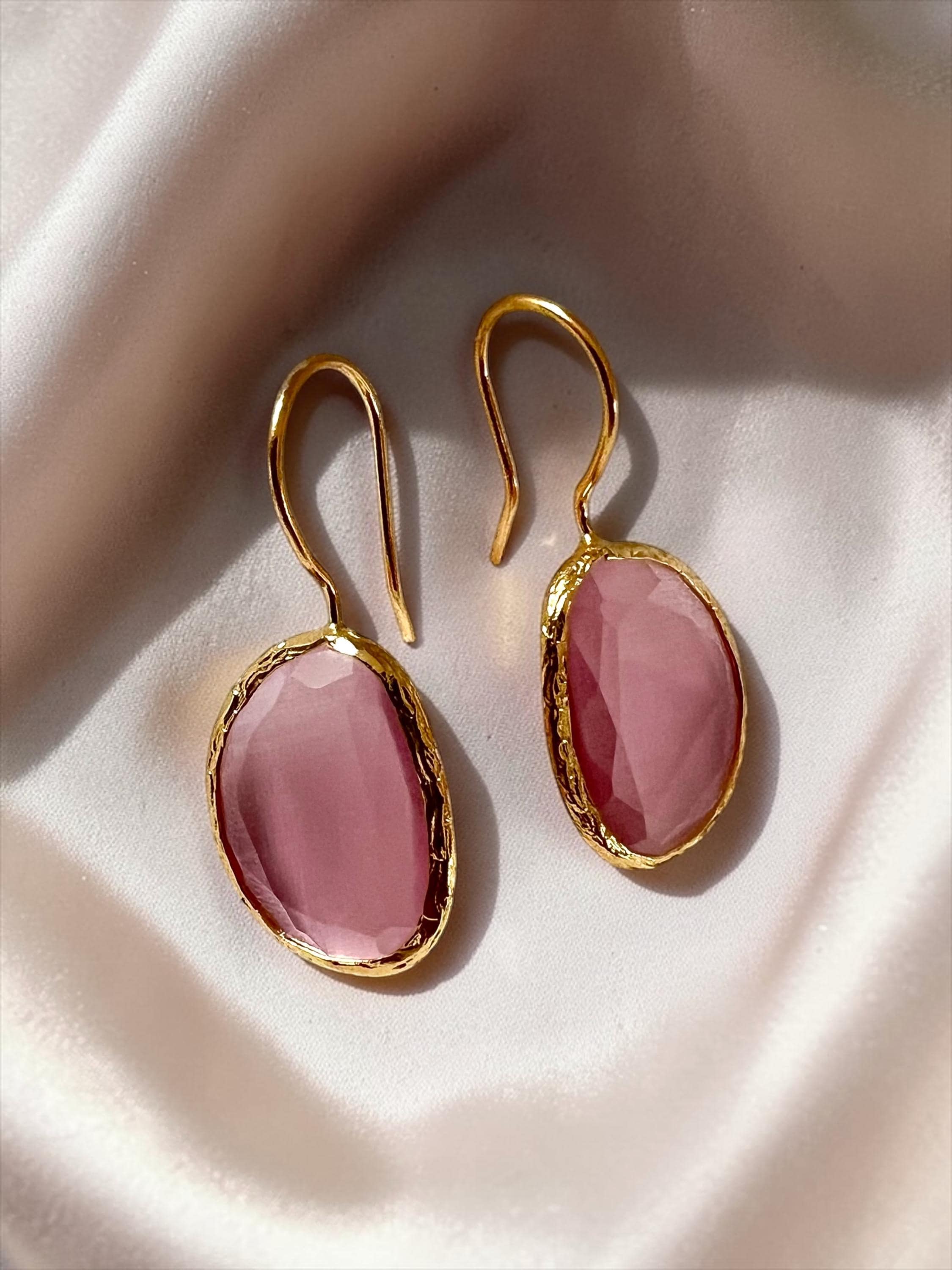 Gold pink oval cat-eye drop earrings, 22K matte gold plated with pink glass stone