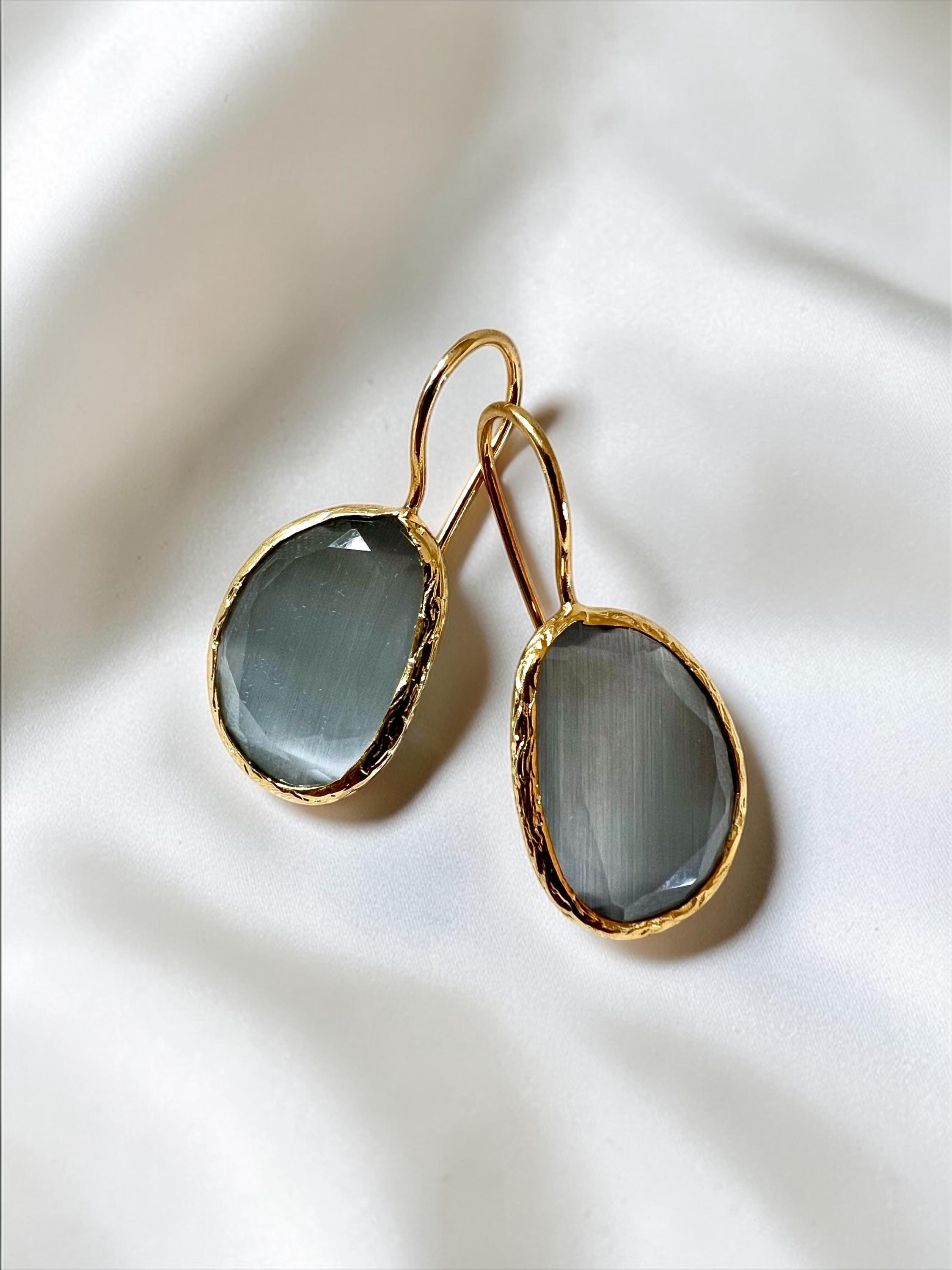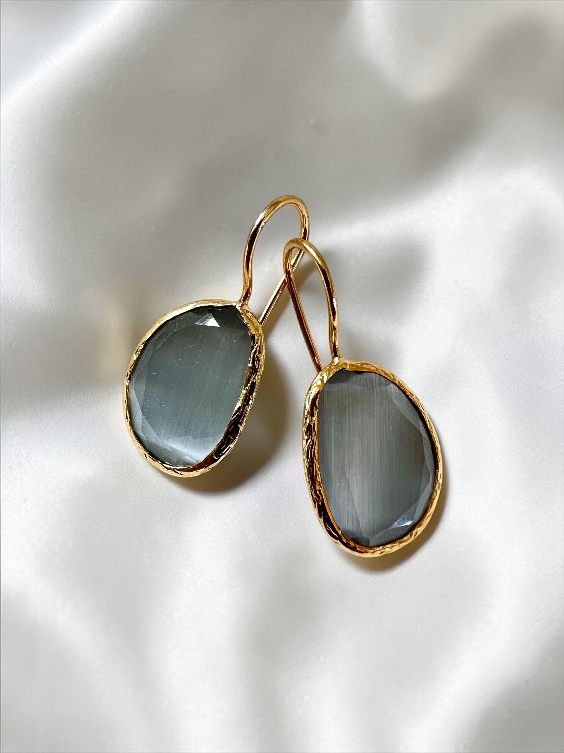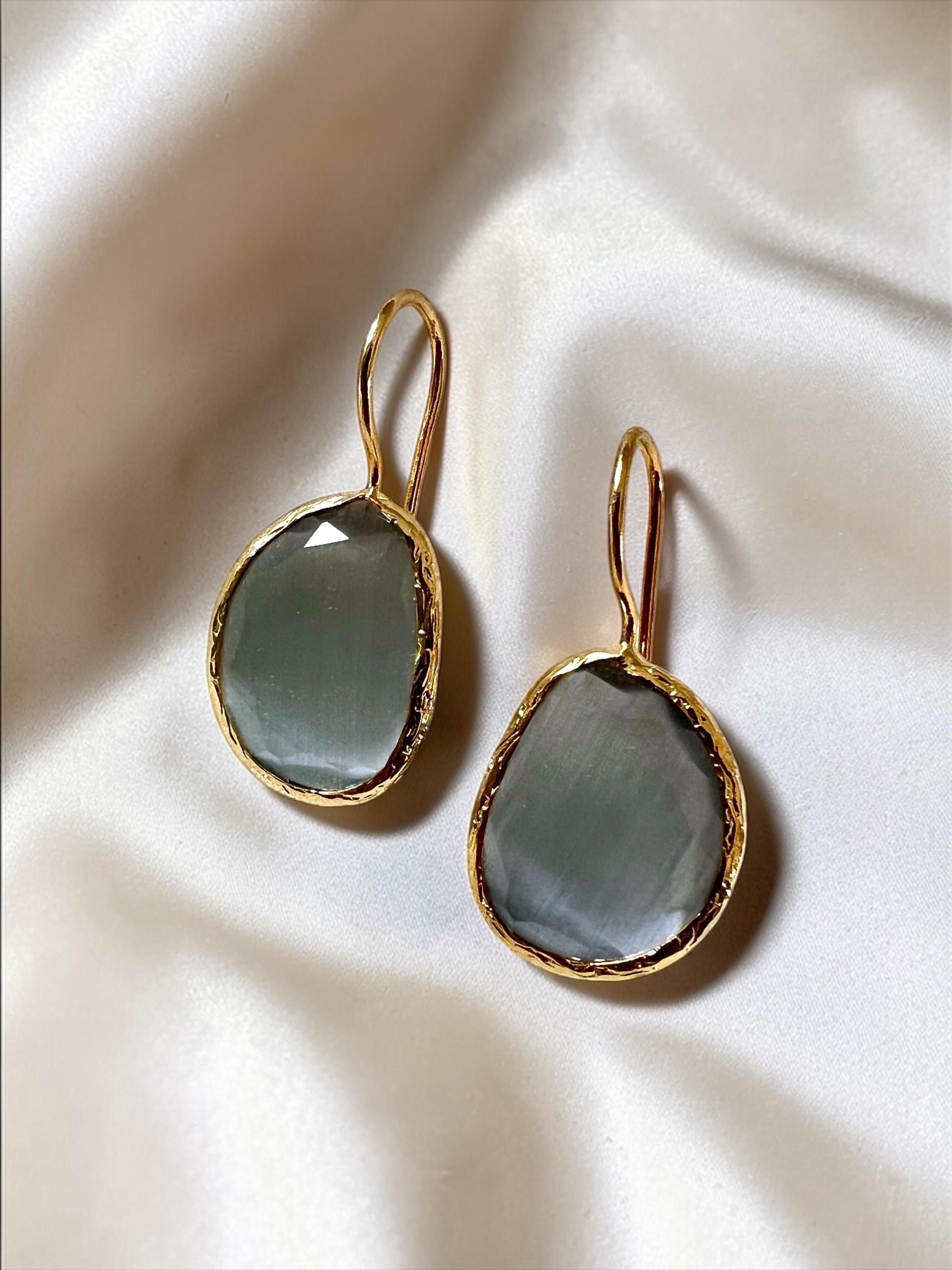 Gold green oval cat-eye drop earrings, 22K matte gold plated with blue-grey glass stone