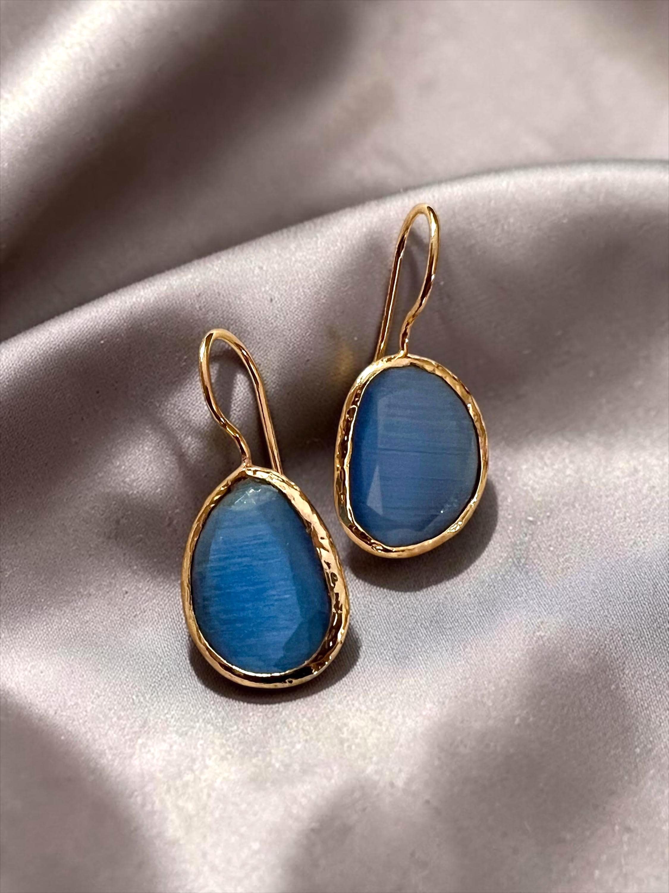 Gold and blue oval cat-eye drop earrings, 22K matte gold plated with blue glass stone