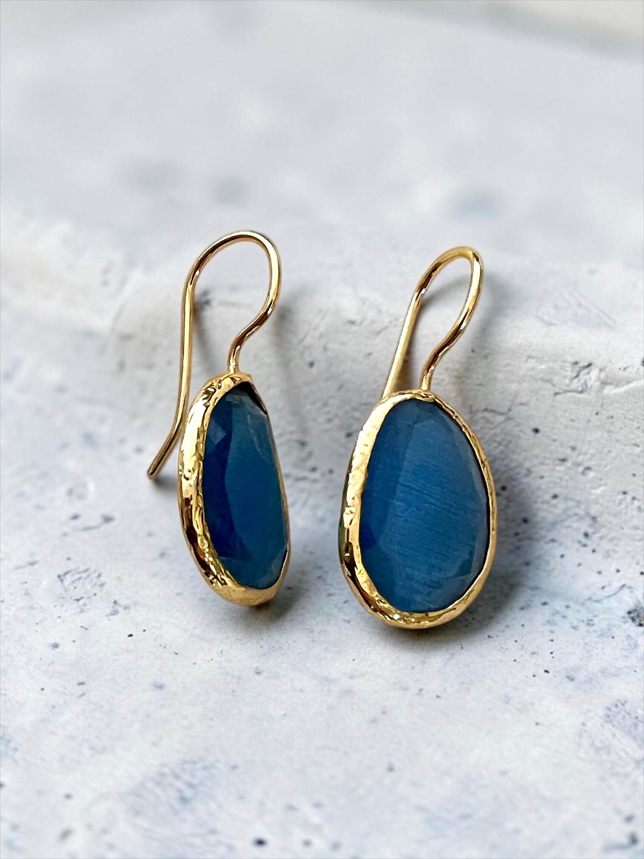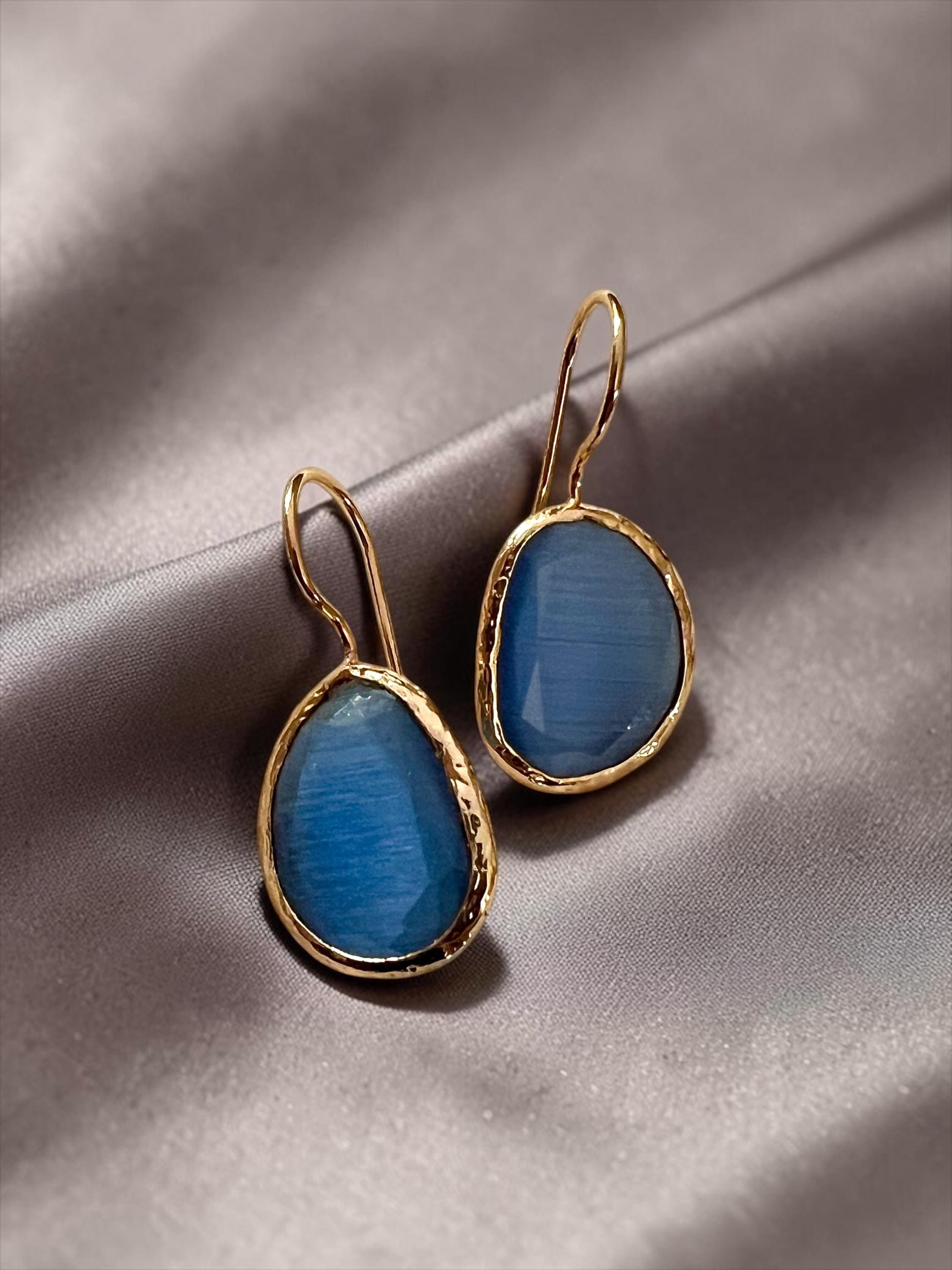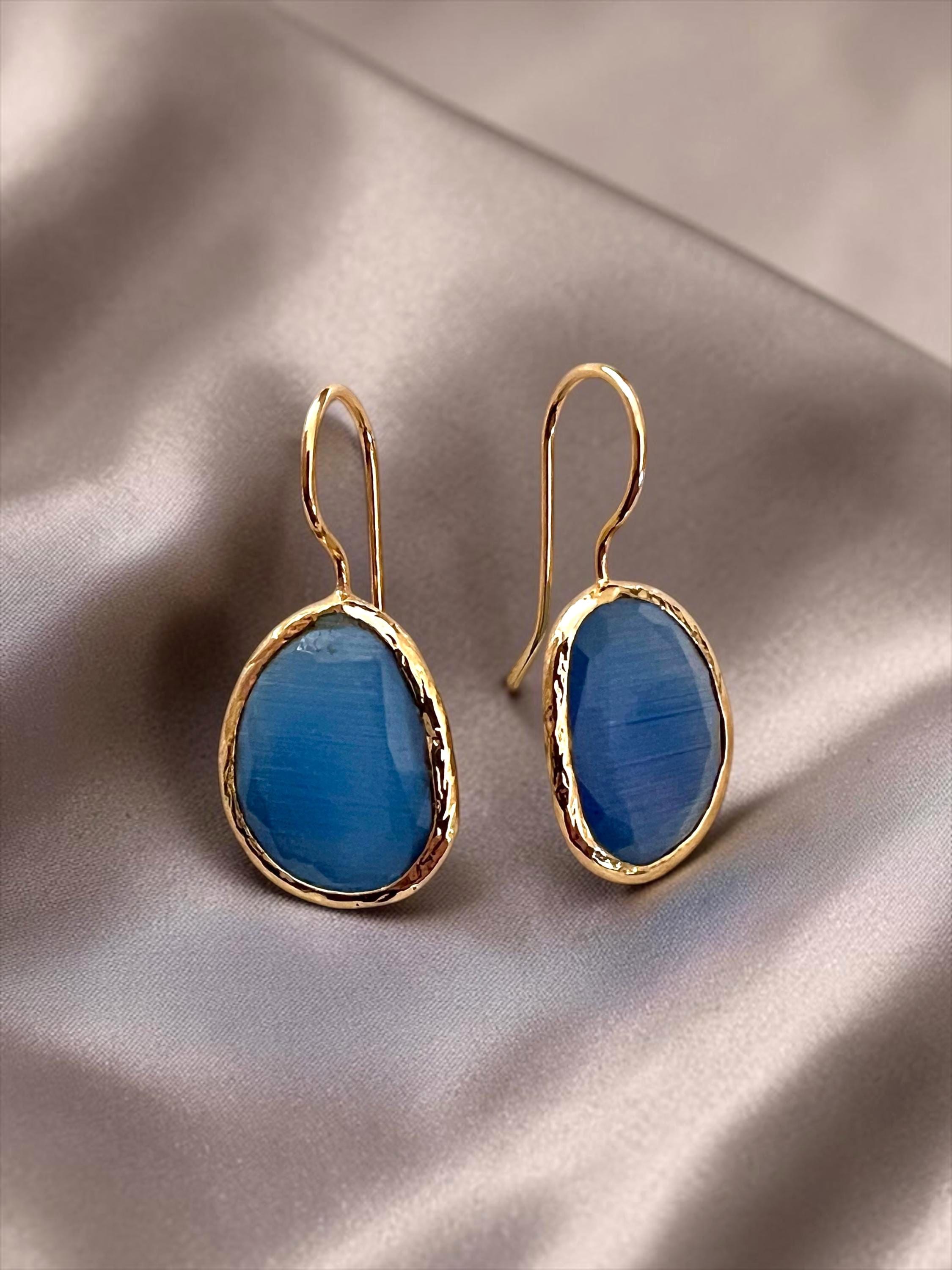 Ebb and Flow Gold Blue Cat-Eye Drop Earrings - Baltic Gold Earrings Minimalist Elegant, Gift for Her