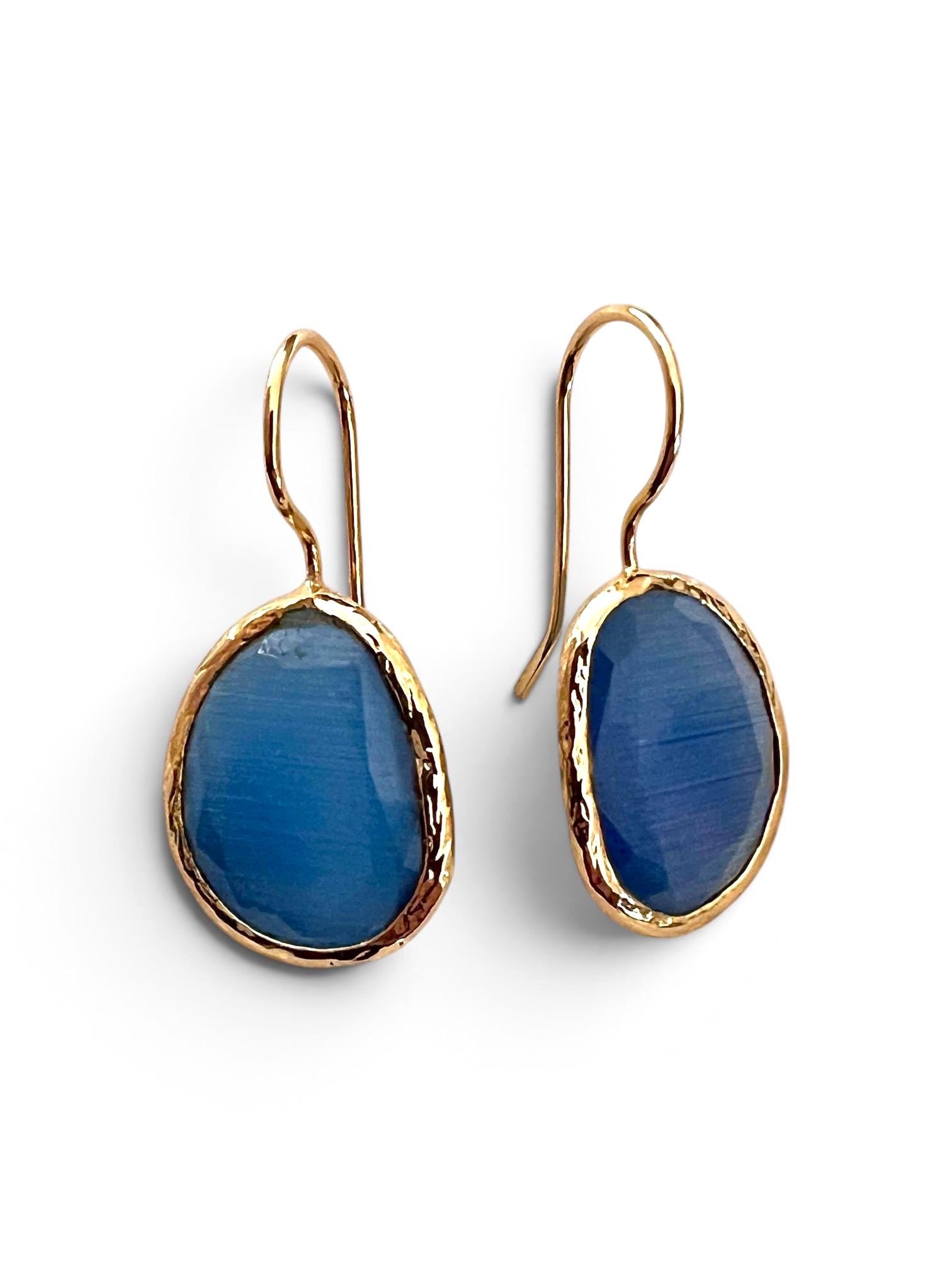 These elegant gold drop earrings with a blue cat-eye stone are a real eye-catcher for any occasion. The stone shimmers and changes color depending on the light.