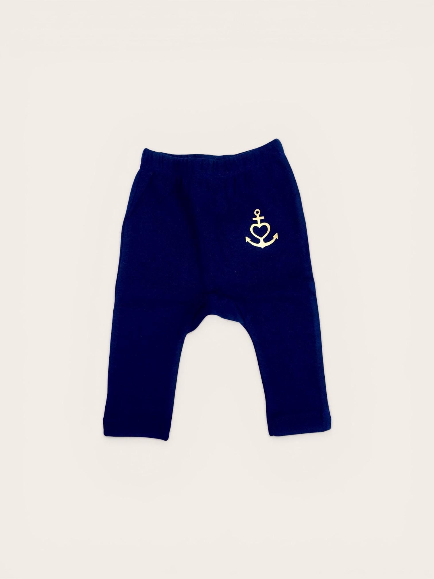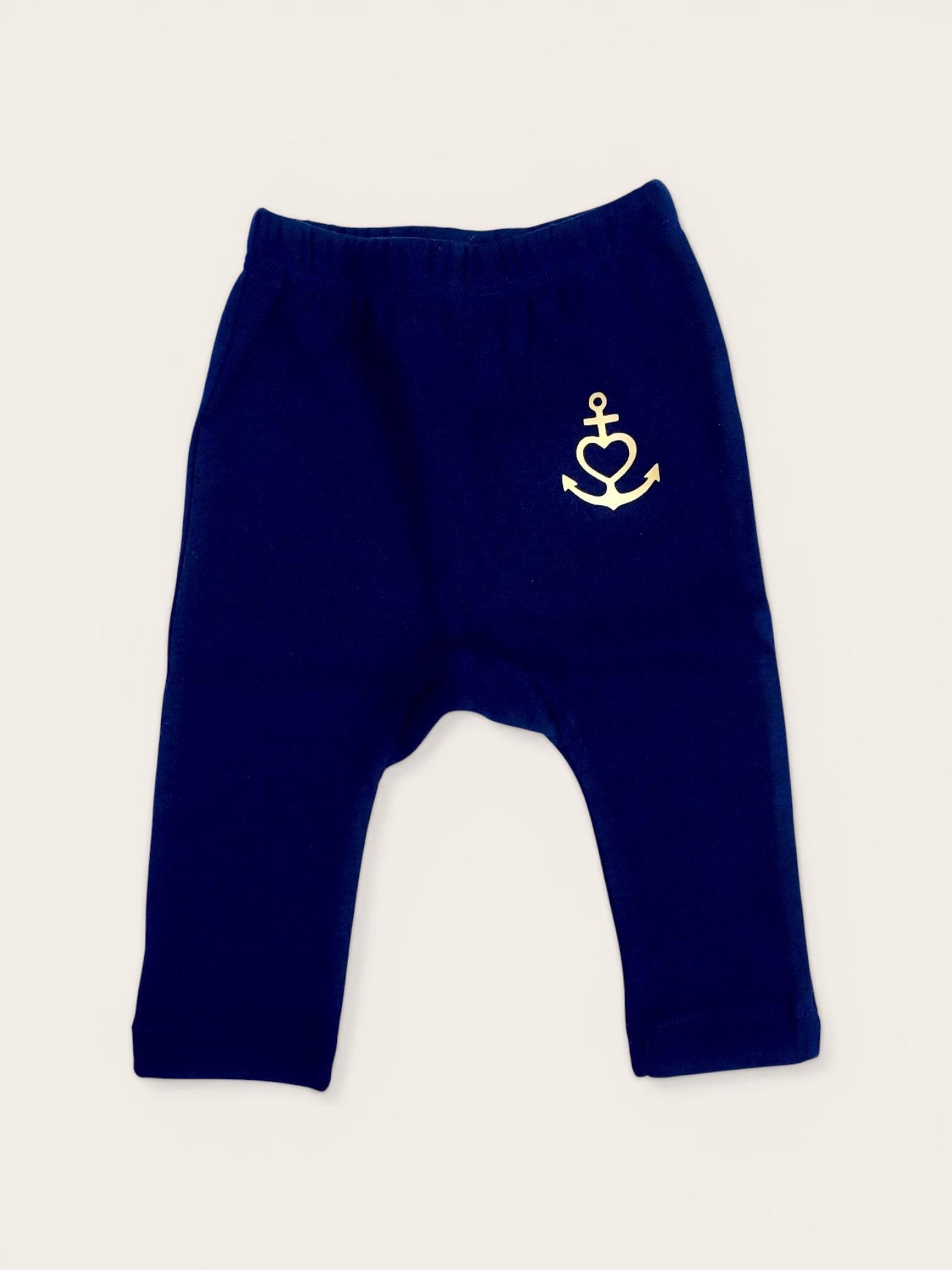 Dark blue baby leggings with a gold anchor and heart symbol. These dark blue baby pants are ethically produced from organically grown cotton, very comfortable, and beautifully soft. The "anchor with heart" print symbolizes faith, love, and hope.