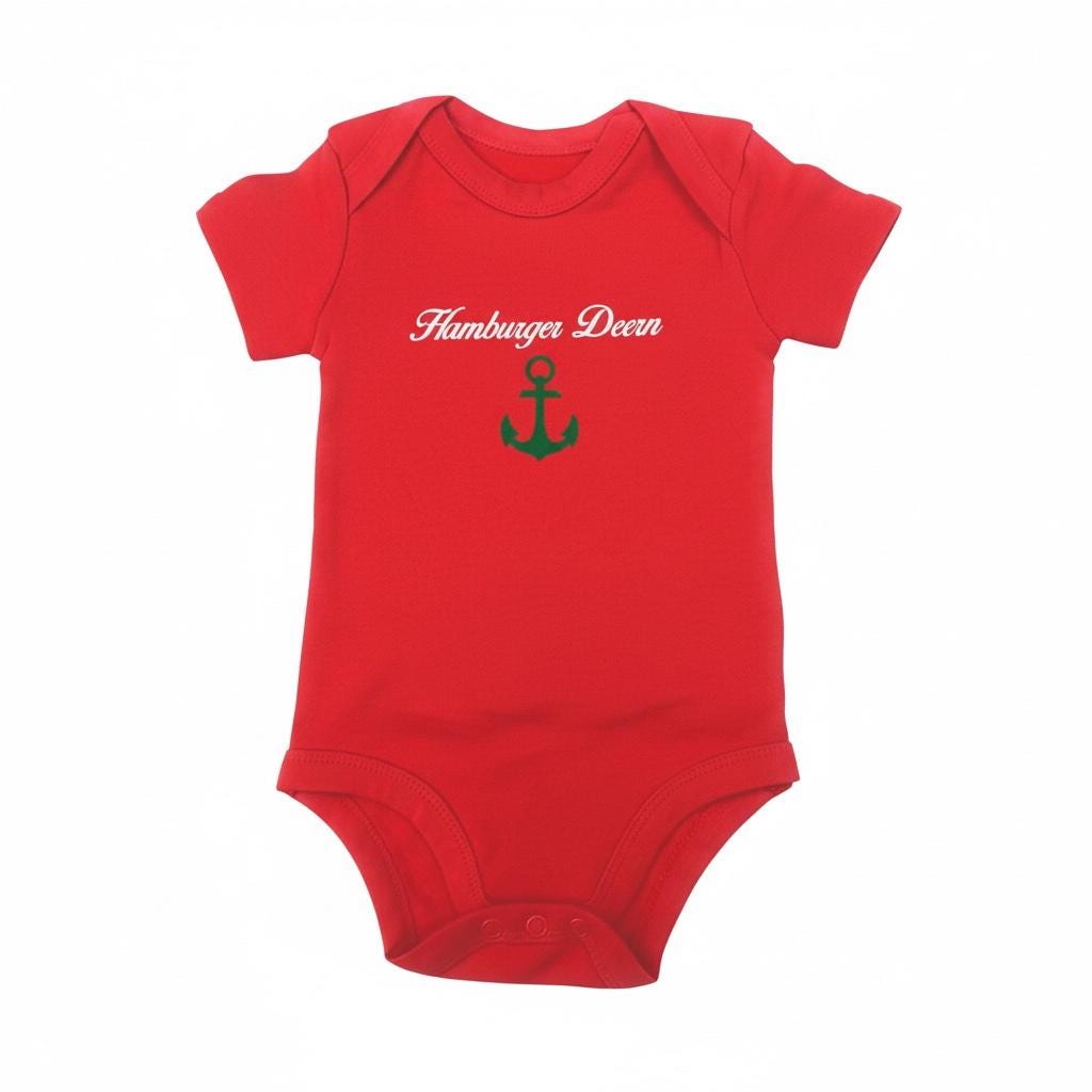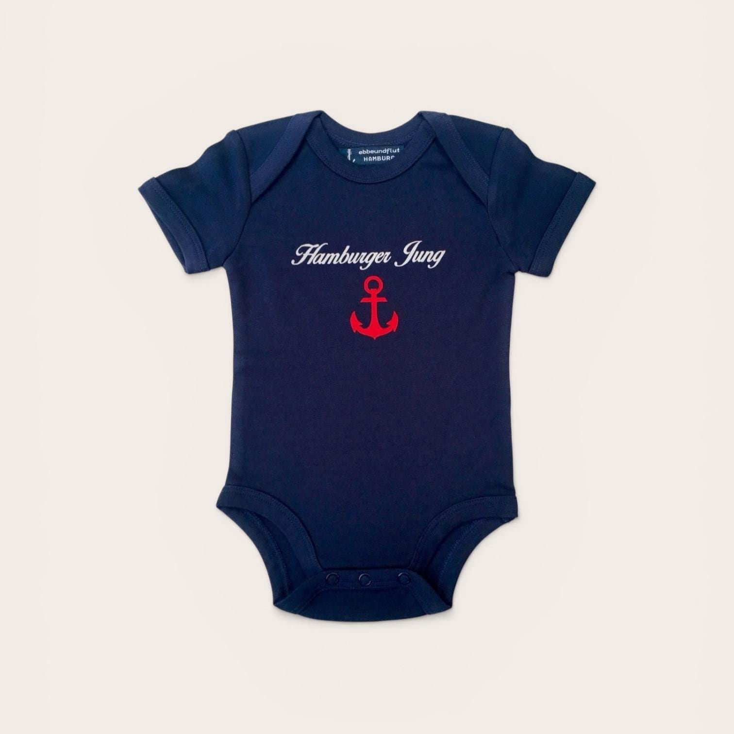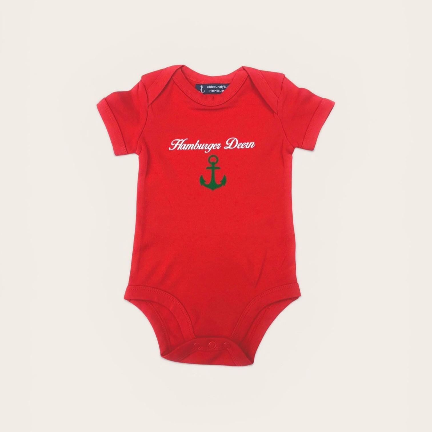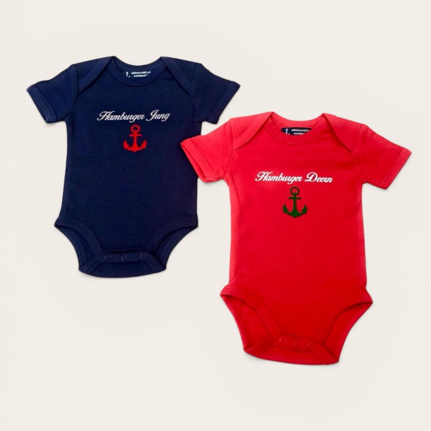 The set consists of a dark blue baby bodysuit with a red port anchor under a white curved inscription "Hamburger Jung", and a red baby bodysuit with a green starboard anchor under a white curved inscription "Hamburger Deern".