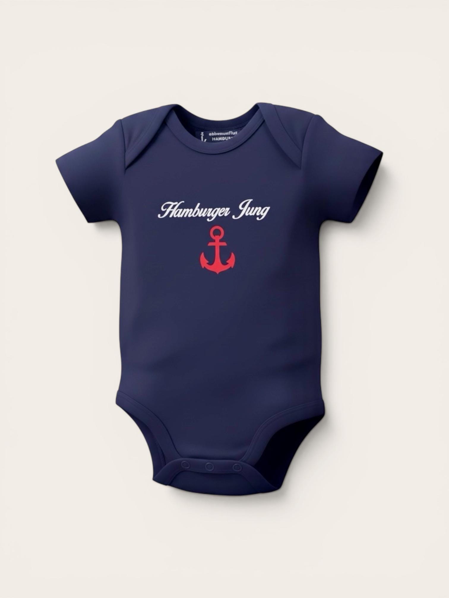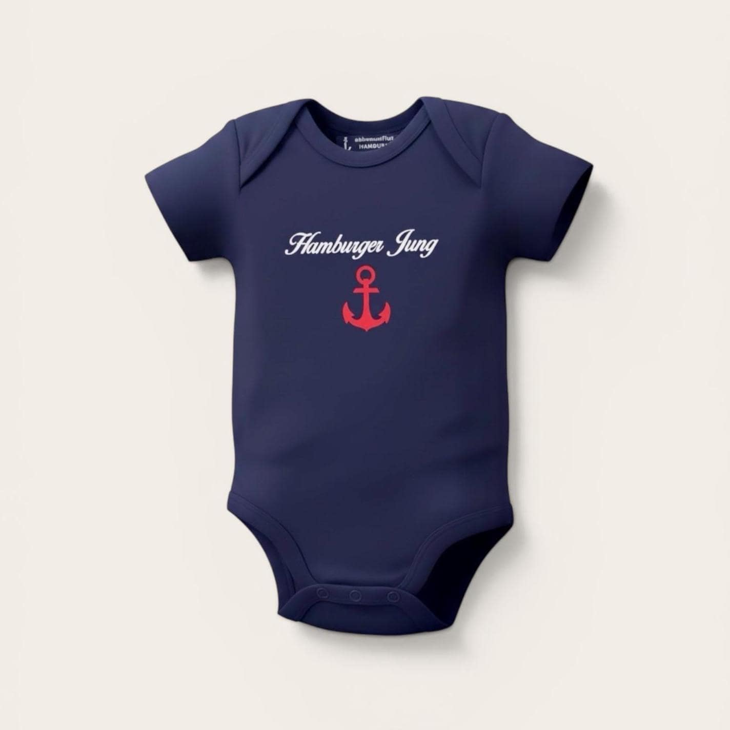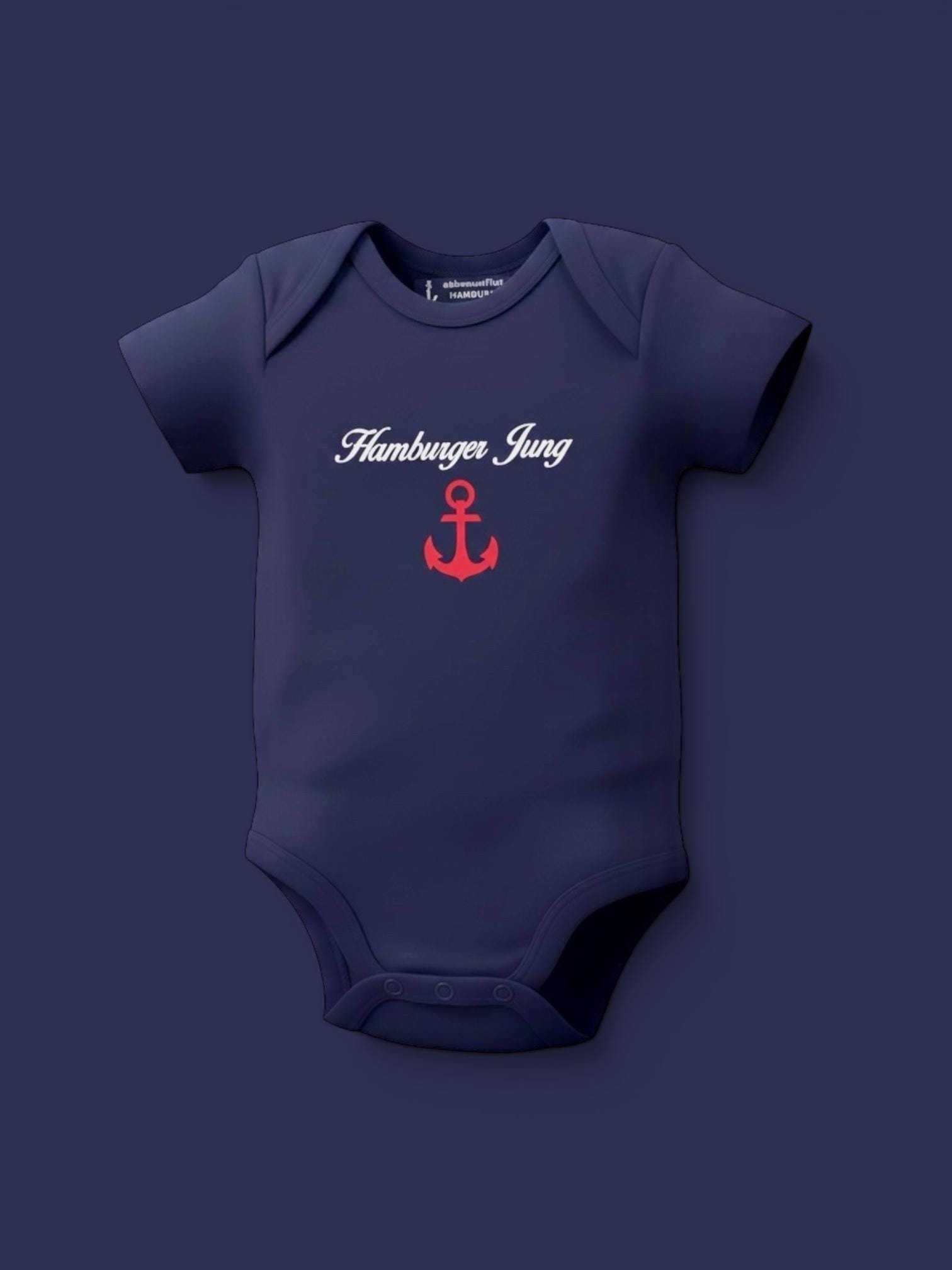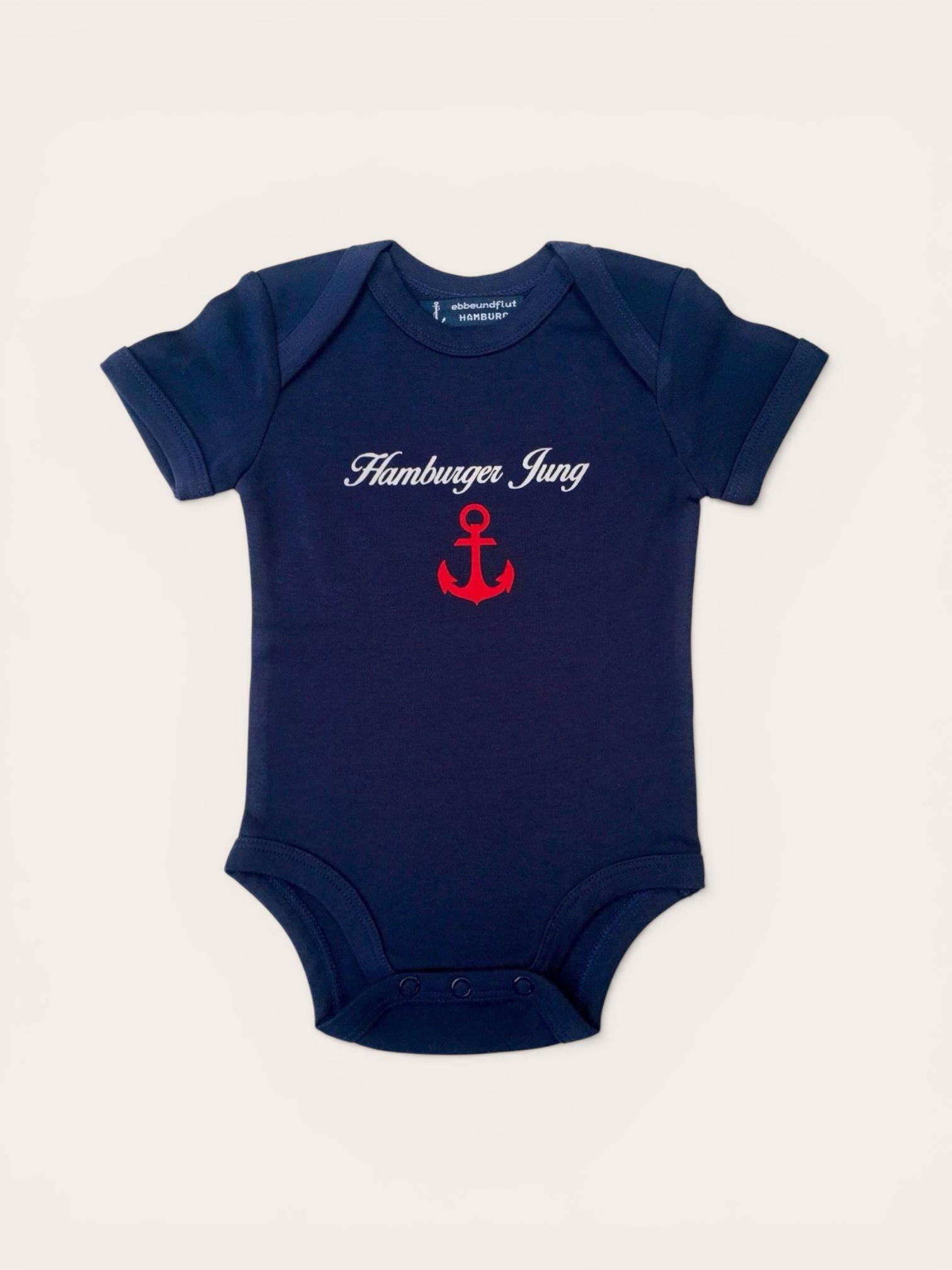 Dark blue baby bodysuit with a red port anchor beneath a grey, curved inscription "Hamburger Jung" (Hamburg Boy). A declaration of love for the most beautiful city and its offspring!